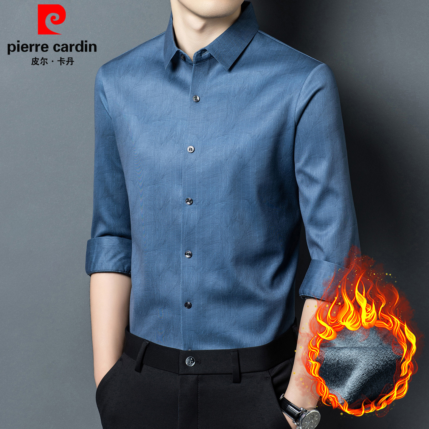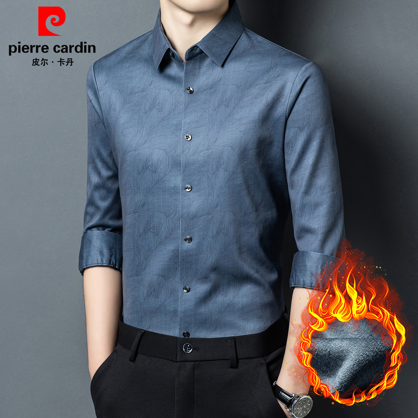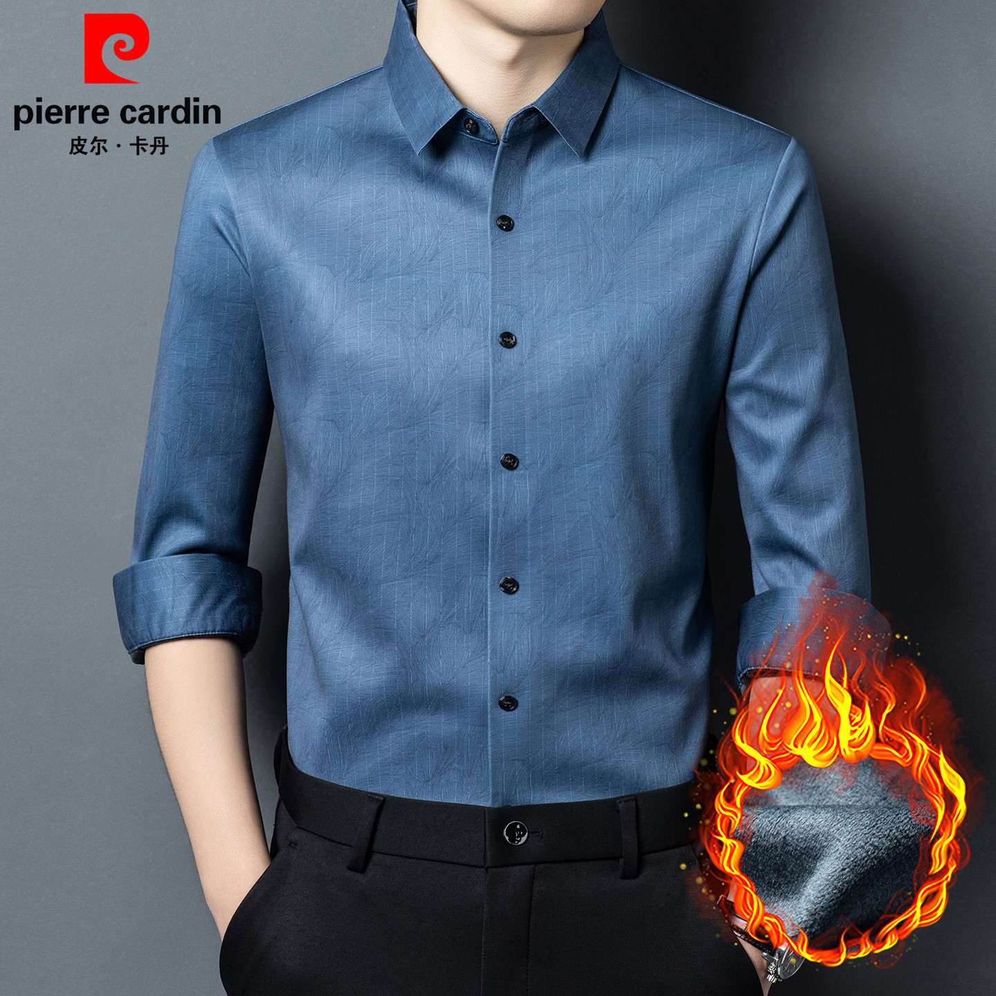 皮尔卡丹冬季男士长袖衬衫中年商务休闲翻领加绒加厚保暖免烫衬衣
