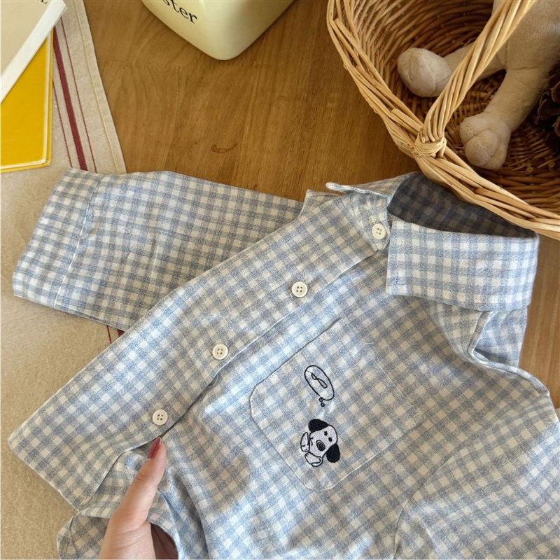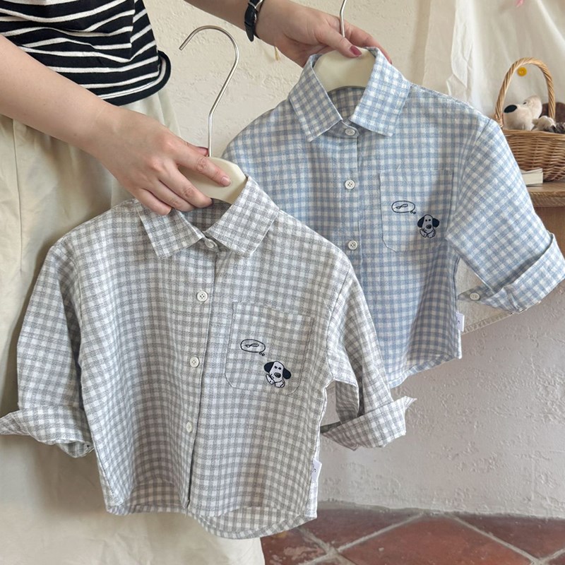 男童格子衬衫春秋款长袖宝宝卡通狗狗衬衣学院风女童秋装外套纯棉