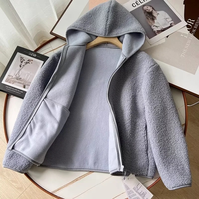 包邮~羊羔绒外套女短款摇粒绒拉链上衣2025秋冬新款加绒连帽开衫