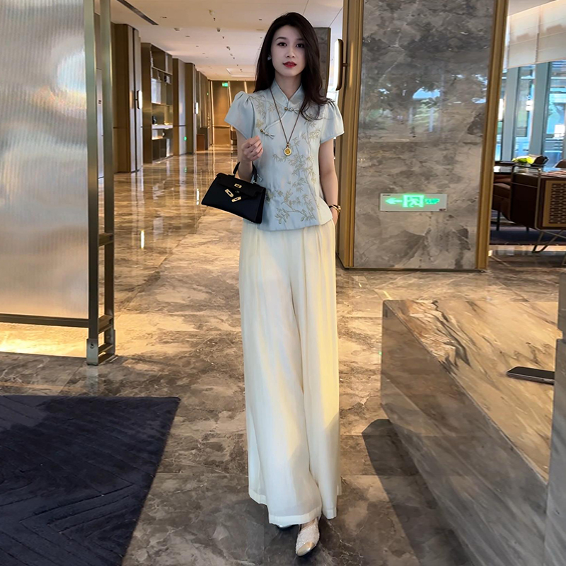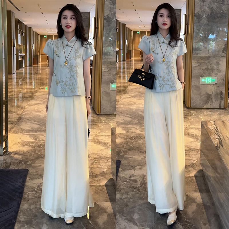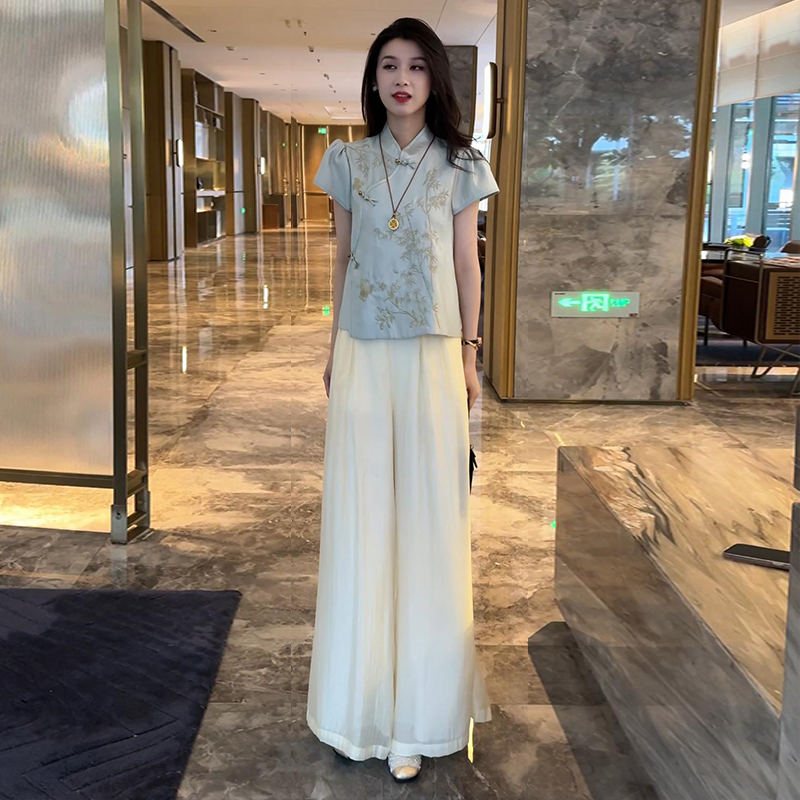 新中式国风套装女夏季新款时尚气质立领盘扣短袖衬衣阔腿裤两件套