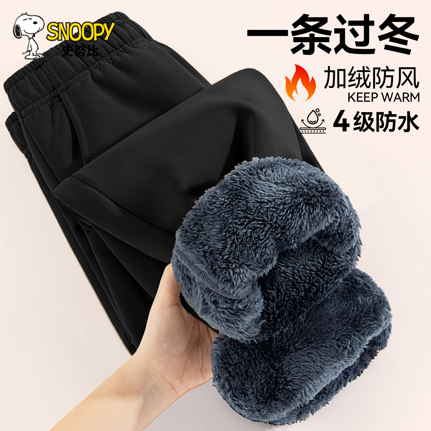 史努比男童加绒裤子男孩黑色加厚防风裤男大童保暖长裤儿童冲锋裤
