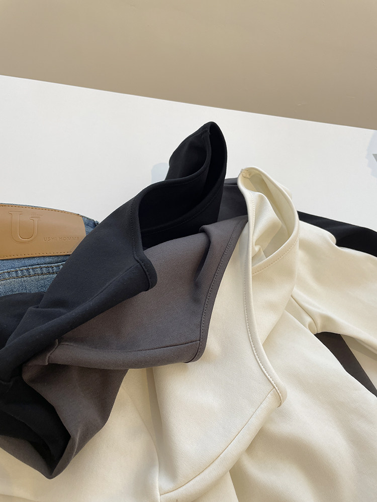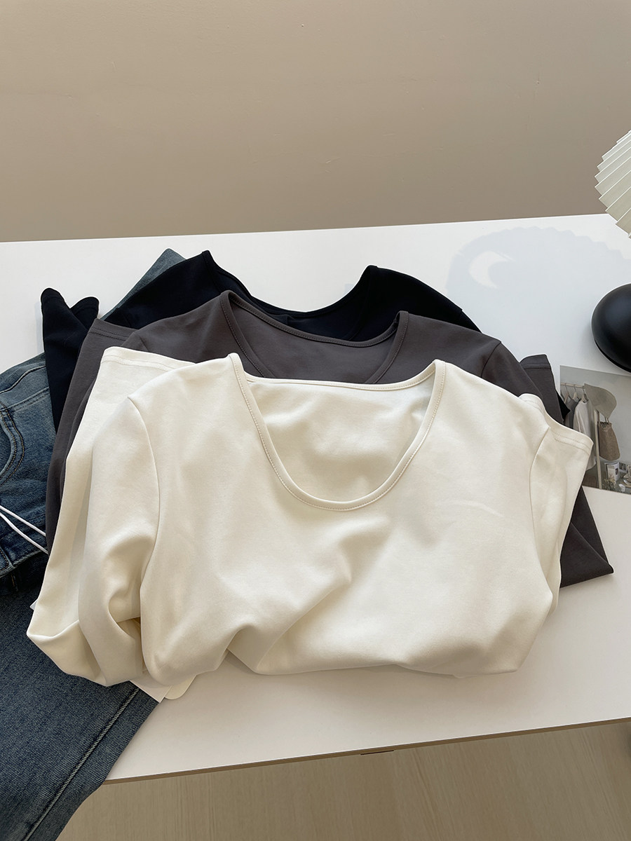 双侧褶皱收腰显瘦长袖t恤女!春秋百搭纯色鹅蛋领弹力修身打底衫