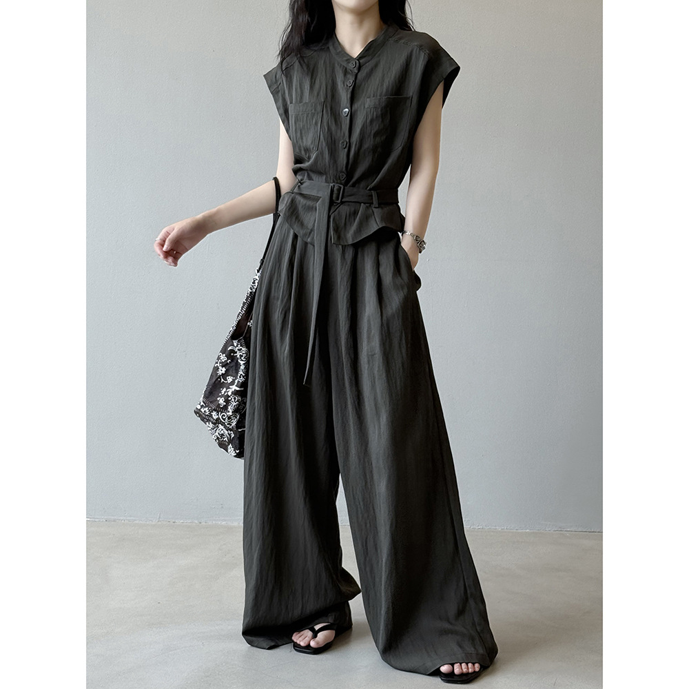 原版!时尚通勤夏季天丝棉圆领无袖收腰衬衫上衣阔腿裤两件套套装