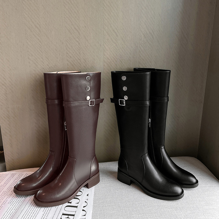机车风 Elegant腿长真皮方头通勤长靴女靴子粗跟中跟牛皮显瘦高筒