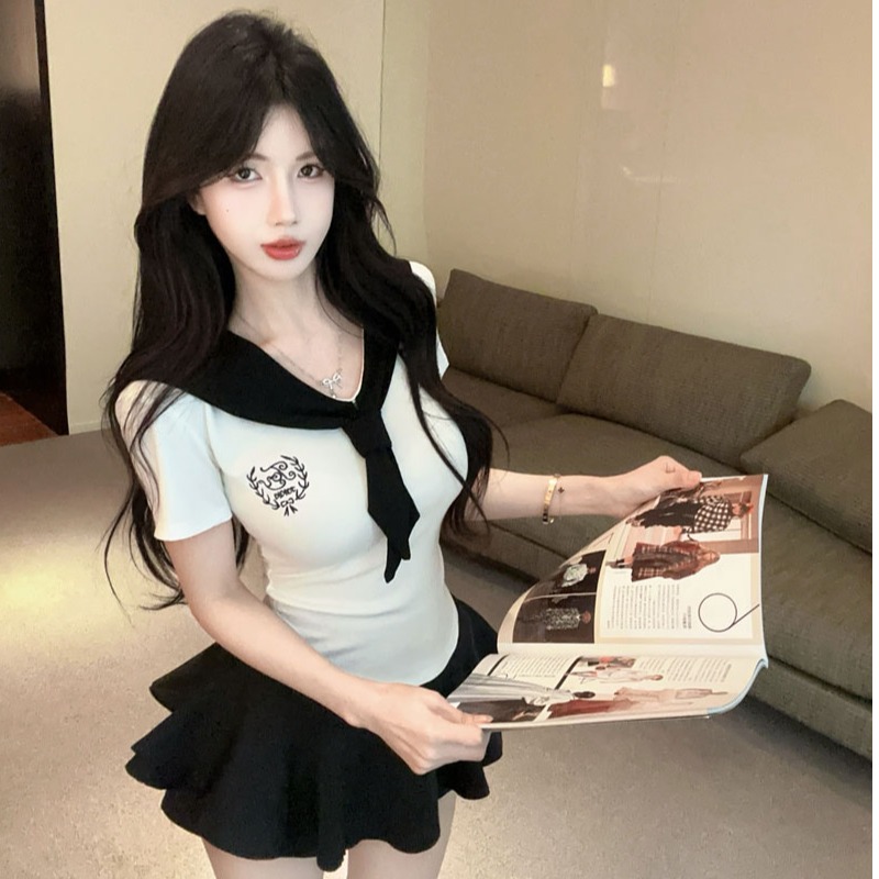学院风辣妹两件套气质减龄海军领T恤上衣黑色jk甜辣裙裤套装女潮