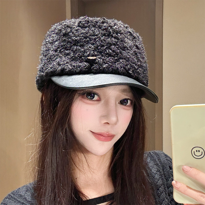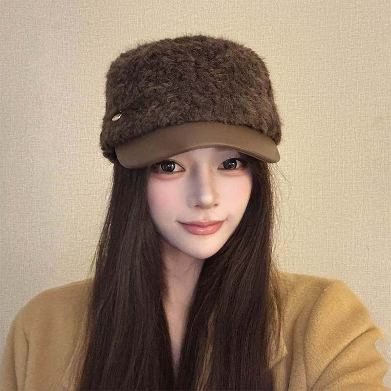 日系鸭舌帽冬季保暖仿羊羔毛短帽皮檐马术帽子女显脸小报童画家帽