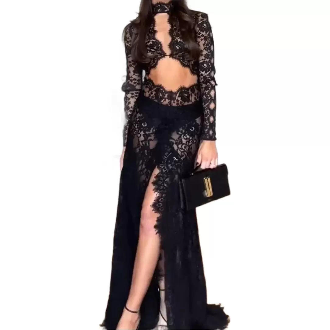 欧美性感亚马逊时尚蕾丝镂空高开叉修身长袖连衣裙单件基本款