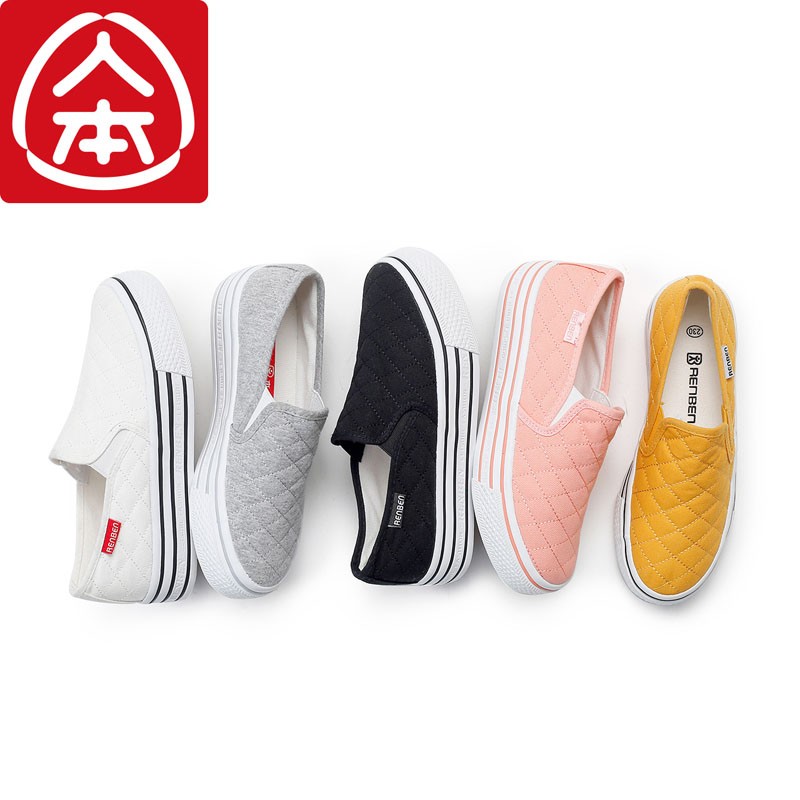 人本帆布鞋女平底厚底小白鞋松糕乐福鞋女一脚蹬懒人鞋白色休闲鞋