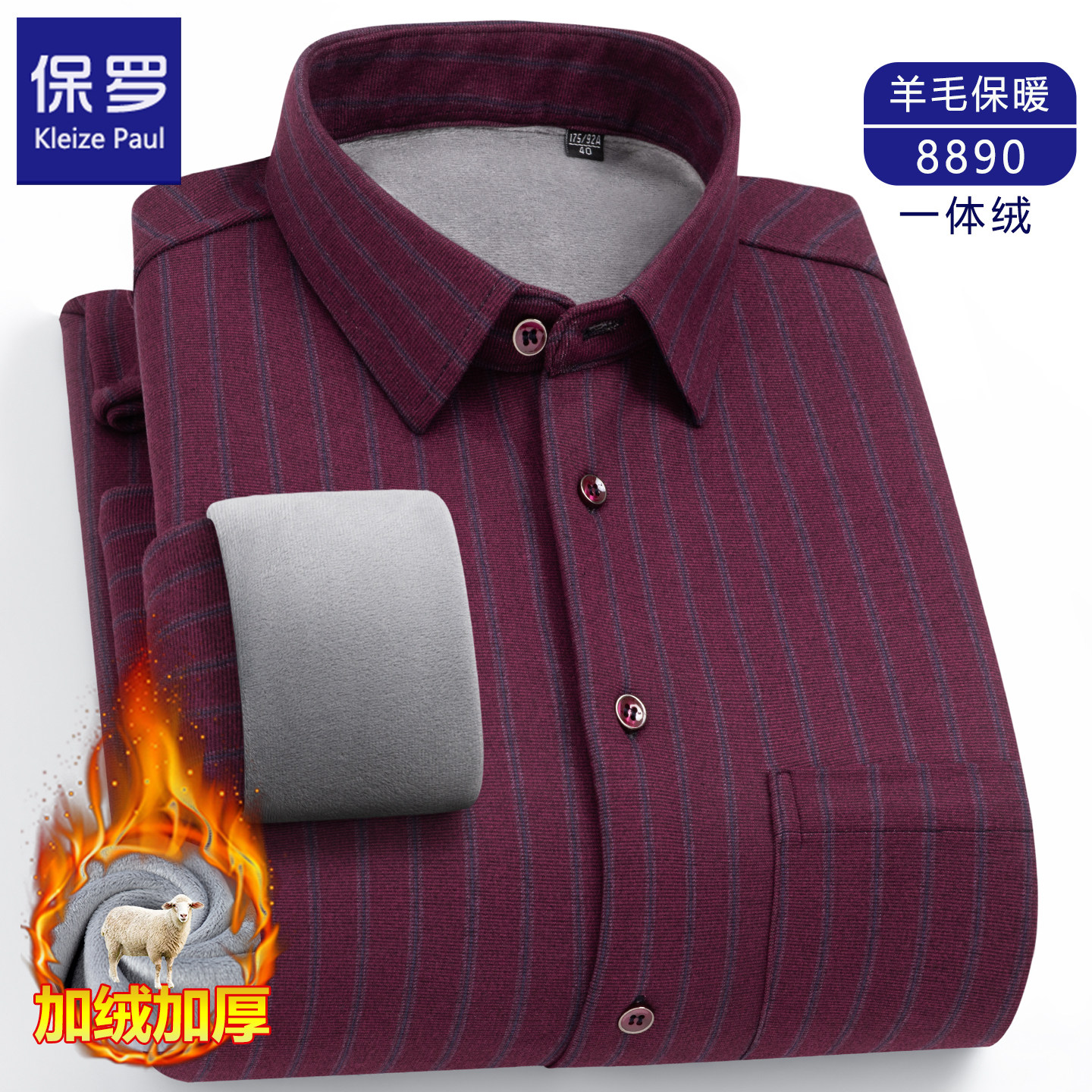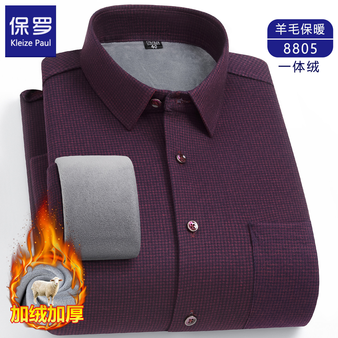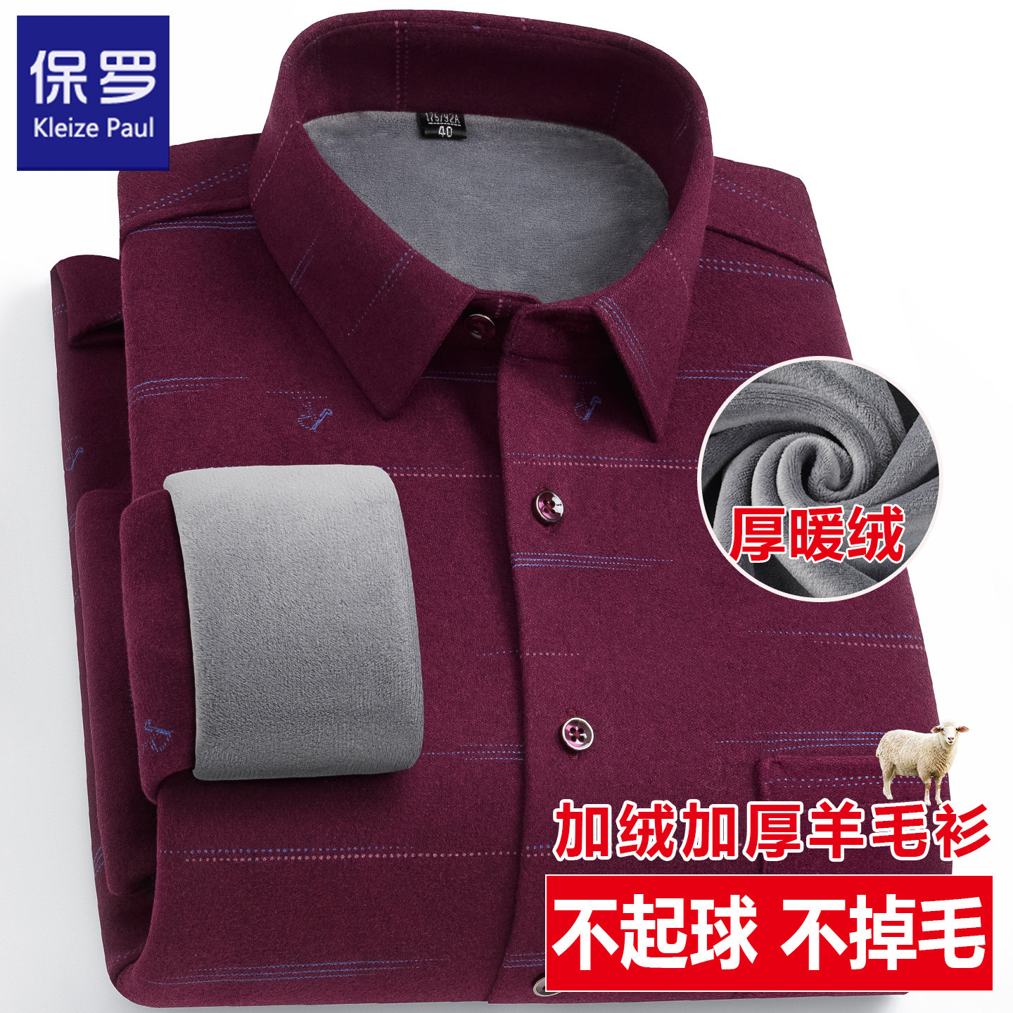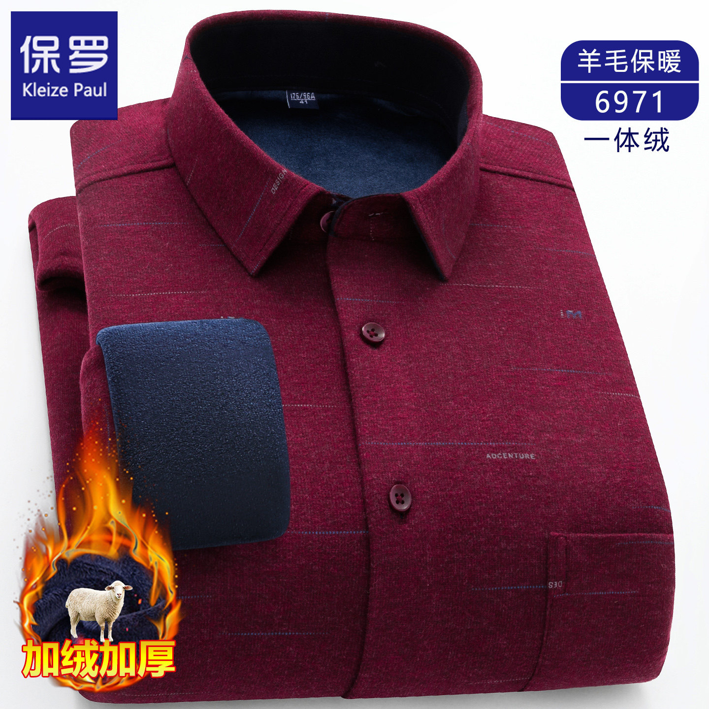 保罗冬季羊毛保暖衬衫男士加绒加厚一体绒印花衬衣中年宽松爸爸装