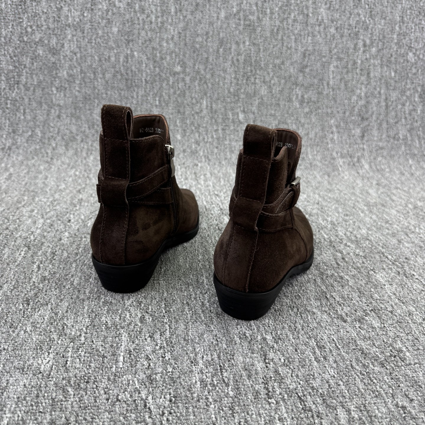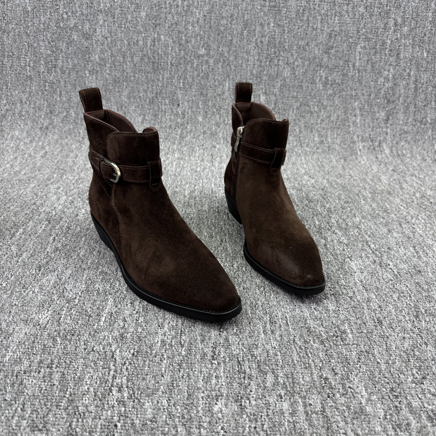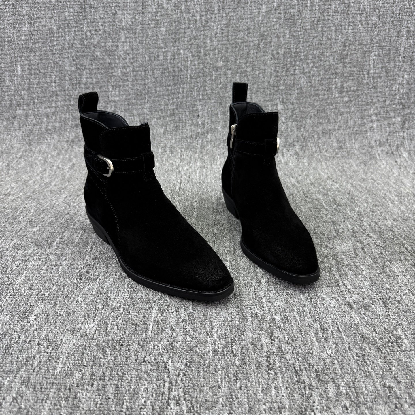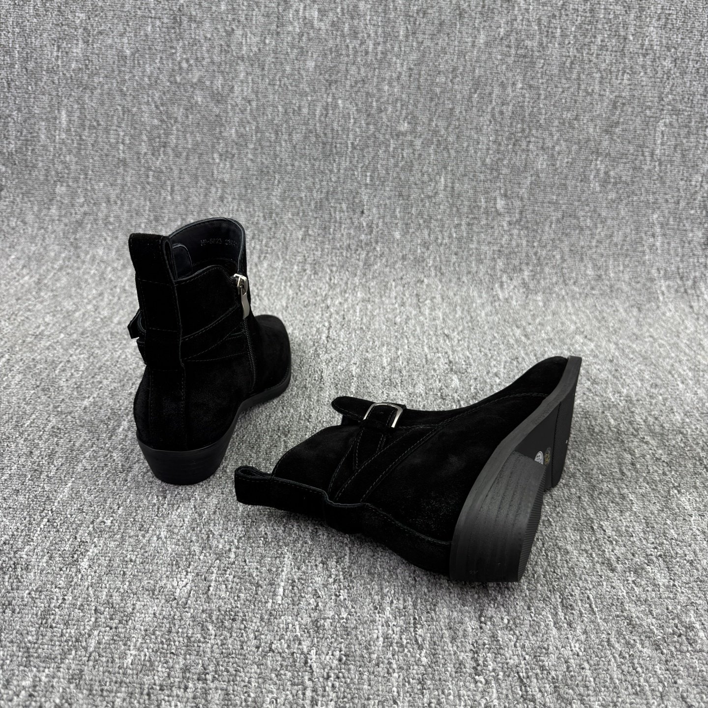 欧洲站欧货真皮女2025秋新款圆头粗跟高跟时装靴皮带扣磨砂皮短靴