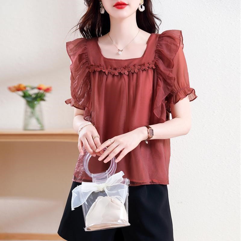 夏季方领雪纺衬衫女短袖2024年新款时尚洋气蕾丝花边小衫短款上衣