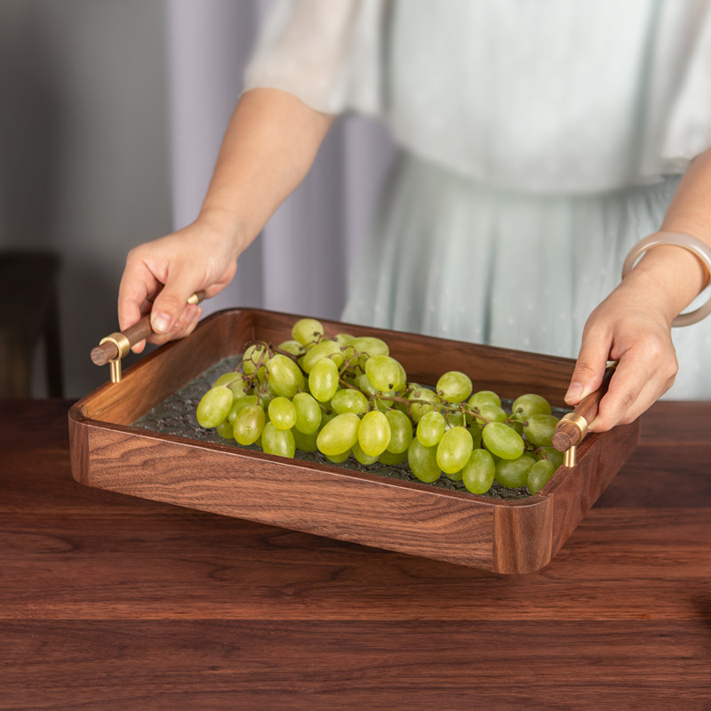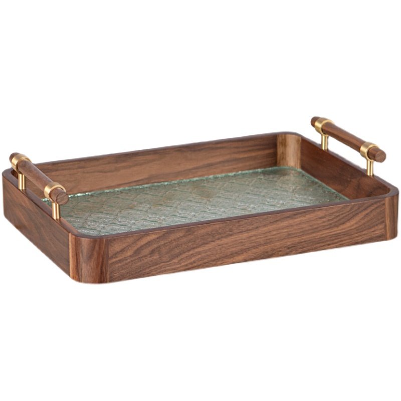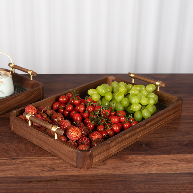 家用复古玻璃托盘新中式黑胡桃实木水果盘早餐糕点水果茶具木托盘