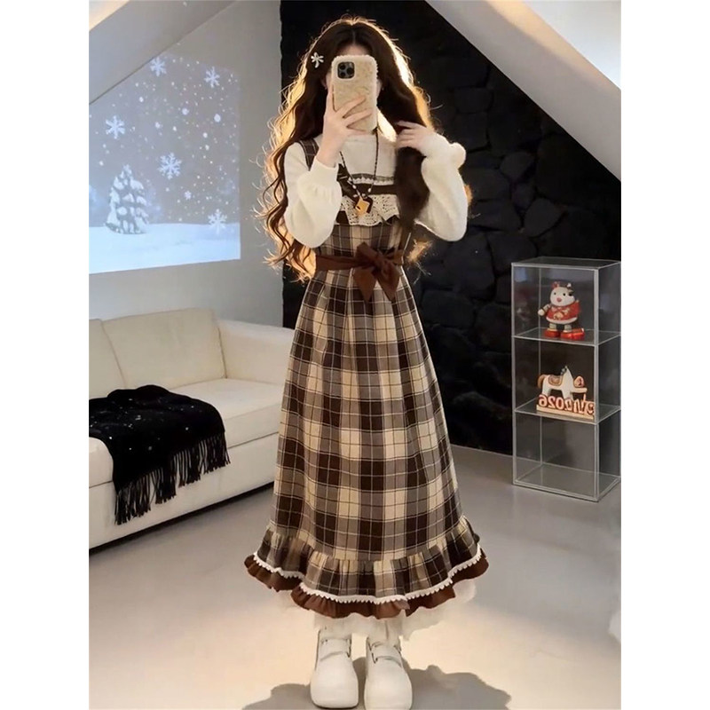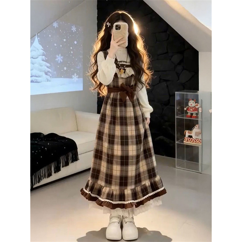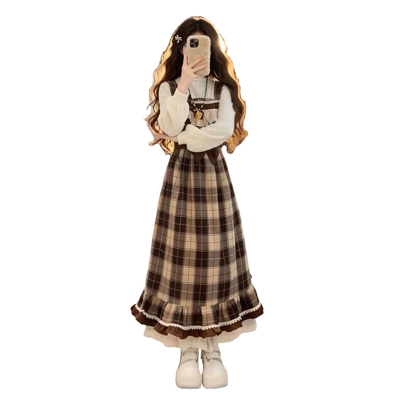 美式学院风设计蕾丝花边拼接格纹背带连衣裙+蕾丝打底上衣两件套