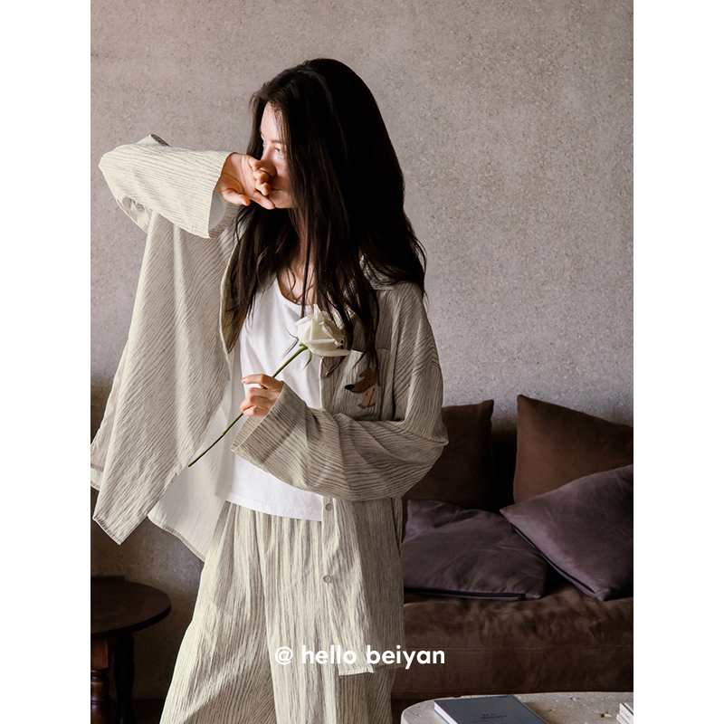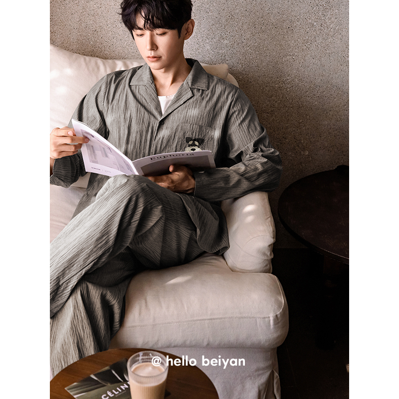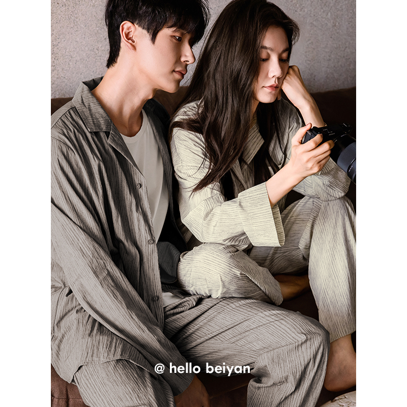 贝妍情侣睡衣女款春秋季莫代尔棉长袖开衫套装男士大码休闲家居服