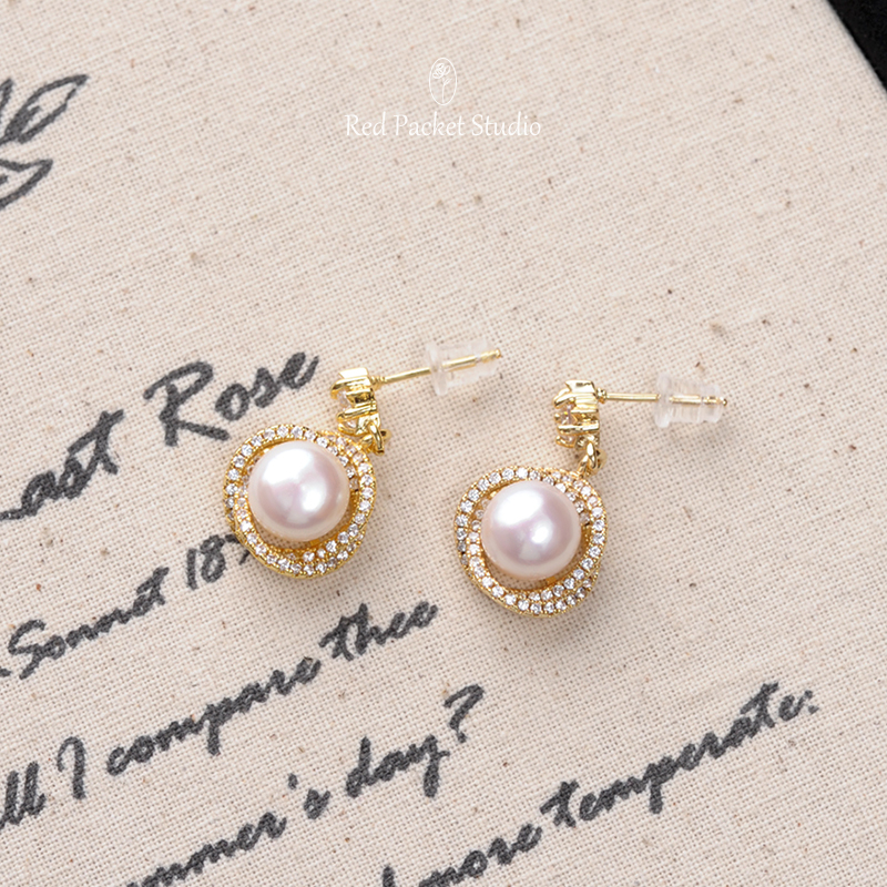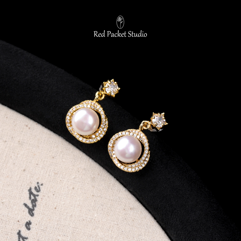 红口袋 法式复古天然淡水珍珠耳环轻奢优雅S925银针镶钻耳钉耳坠