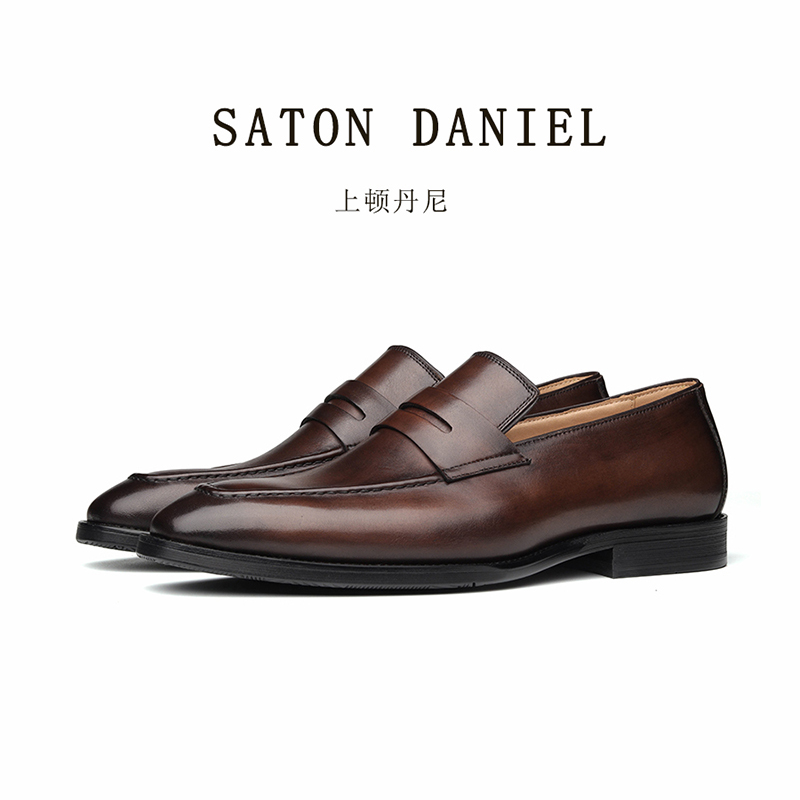 上顿丹尼手工内缝线小方头一脚蹬乐福鞋男便士鞋英伦皮鞋真皮擦色