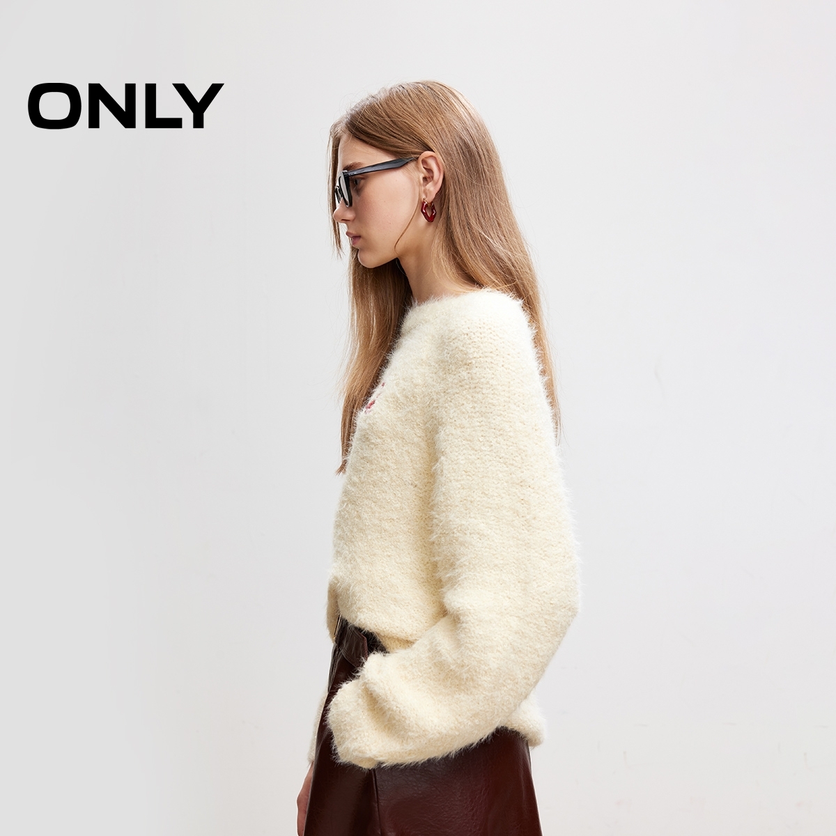 o区绫致ONLY2025春季新款时尚慵懒风绒感宽松圆领针织衫女
