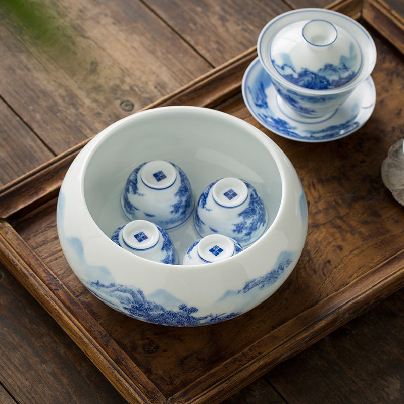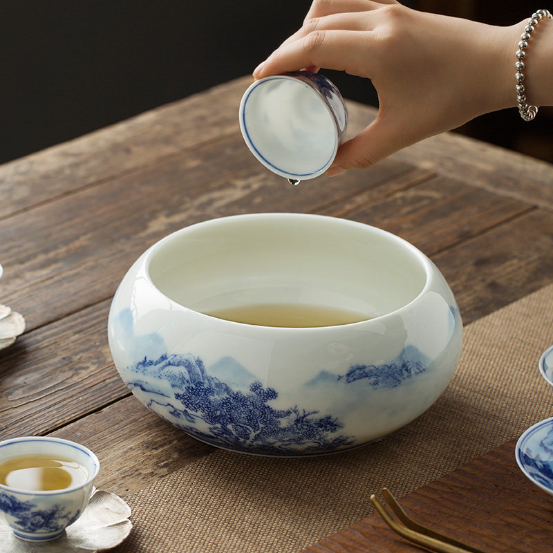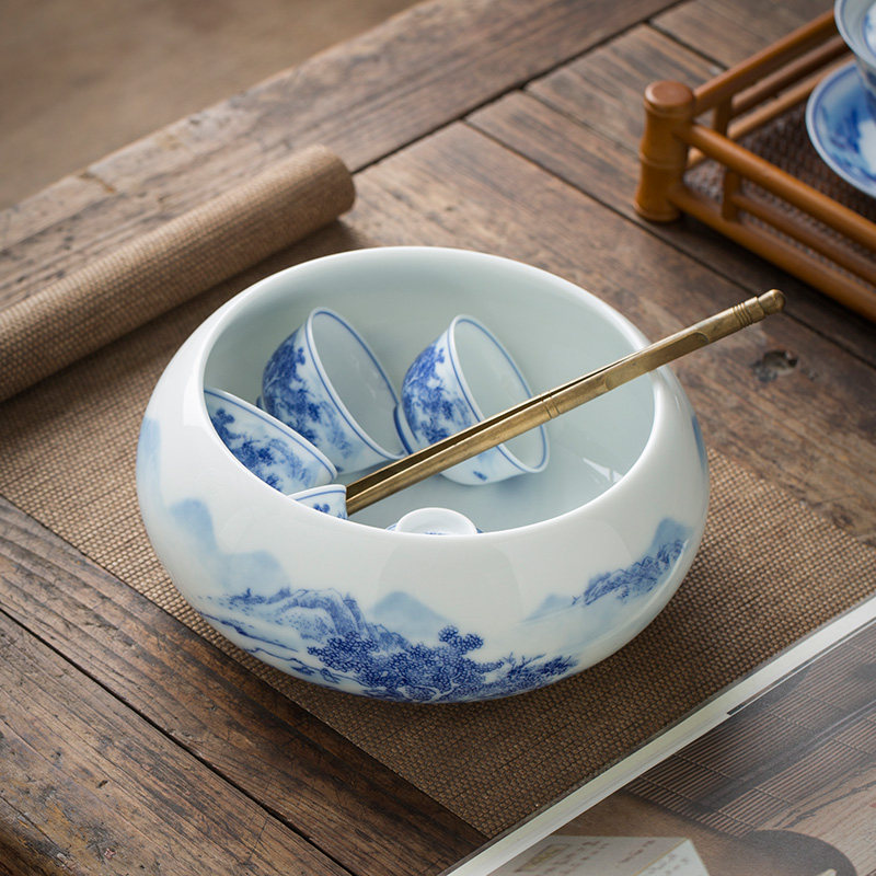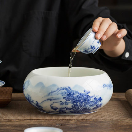 青花陶瓷大号茶洗茶道配件手绘白瓷水洗茶渣桶笔洗水盂建水功夫