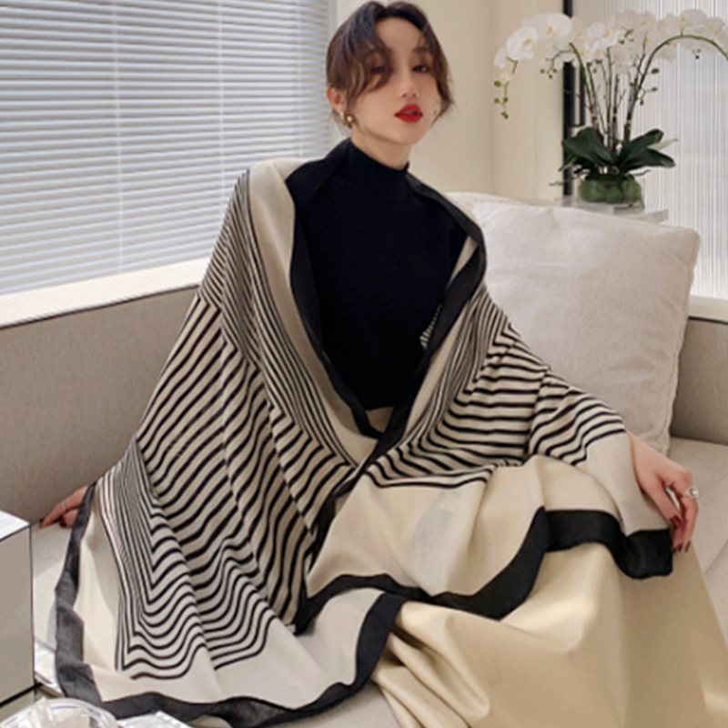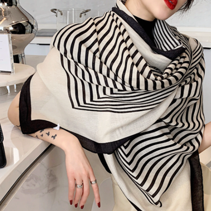 大牌条纹棉麻围巾女秋冬保暖披肩