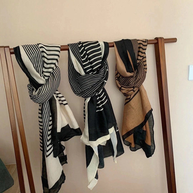 韩系棉麻围巾女冬季高级感时尚洋气条纹丝巾女士秋冬保暖护颈披肩