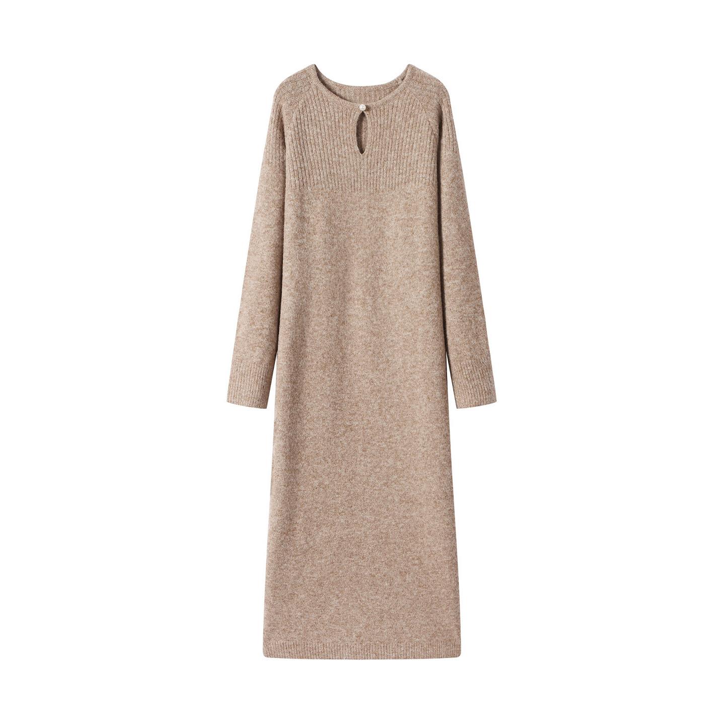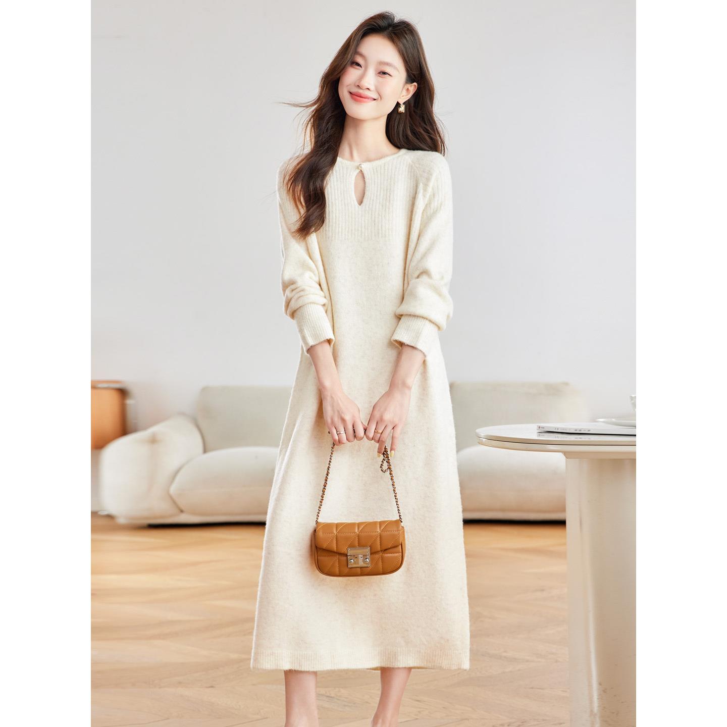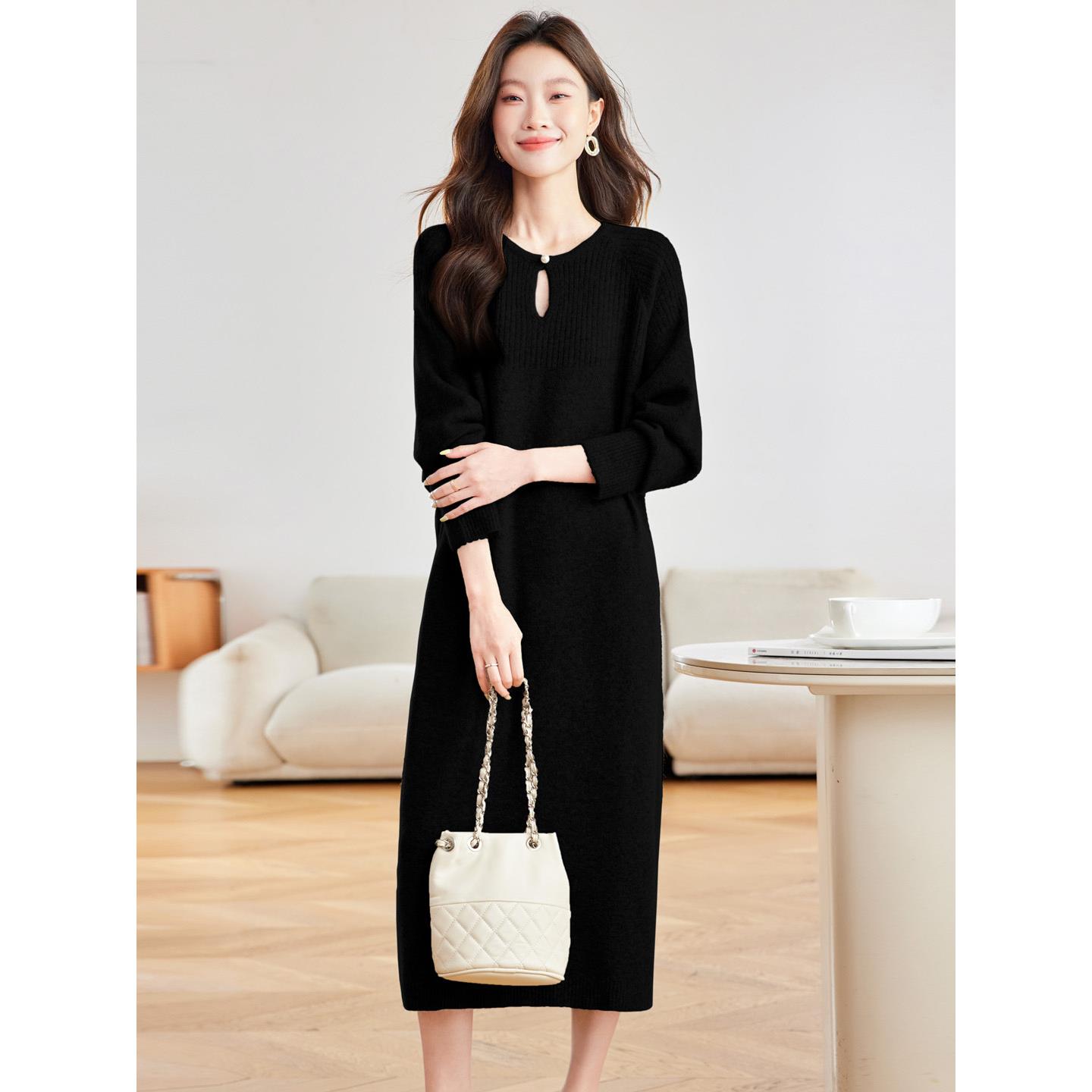 100纯羊毛衫圆领毛衣女秋冬超长款过膝毛衣裙宽松大码女装打底衫