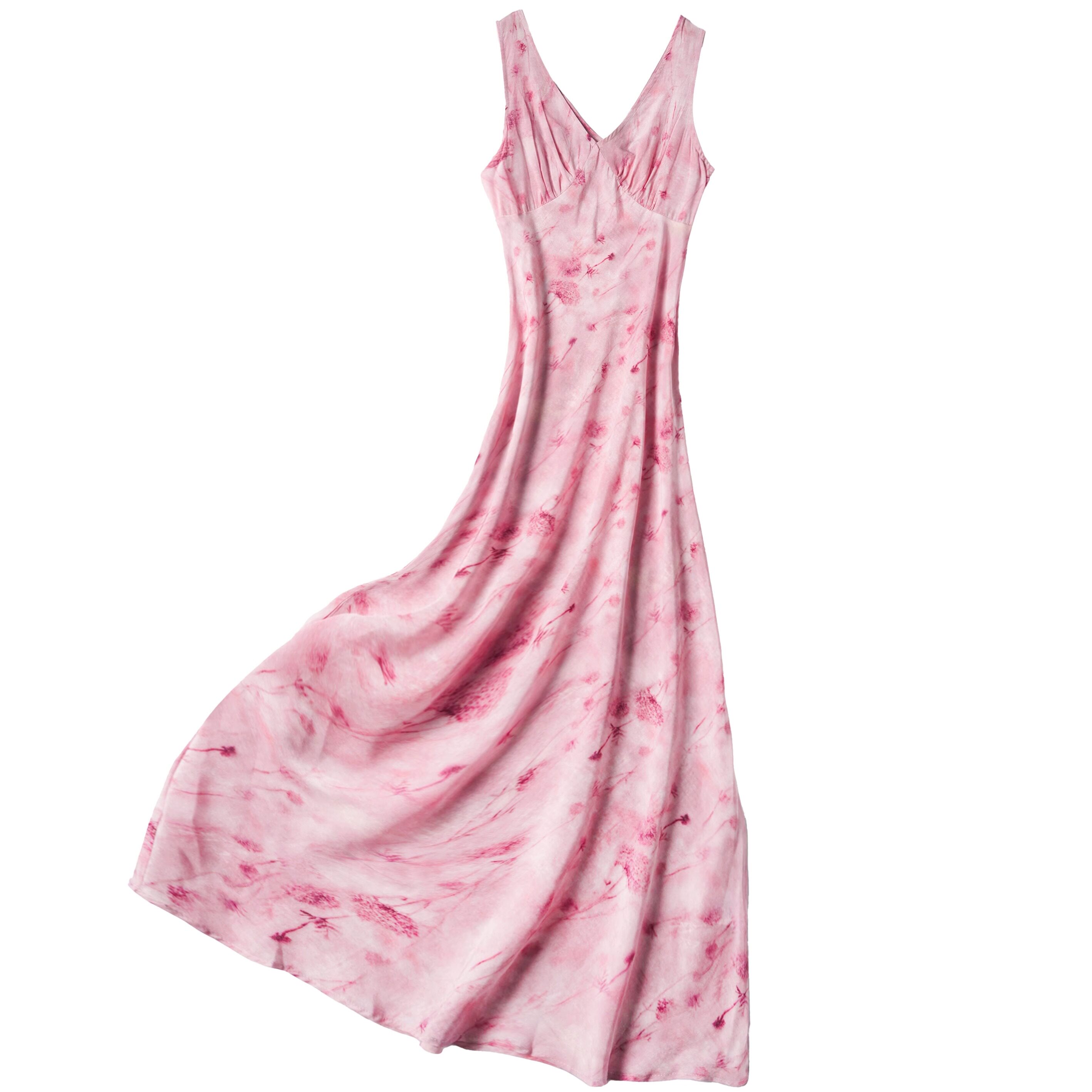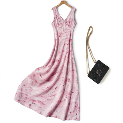 法式气质桑蚕丝真丝粉色碎花V领长款纯欲风气质连衣裙女夏度假裙