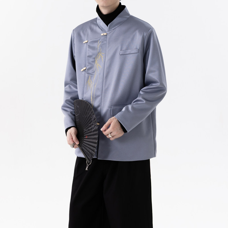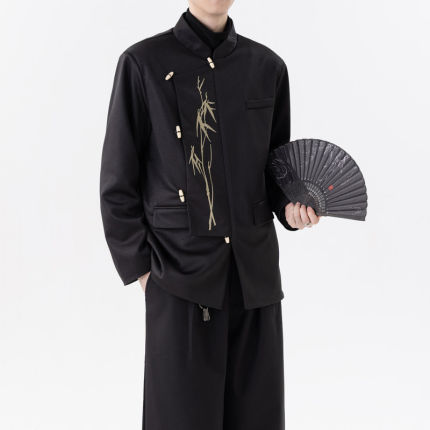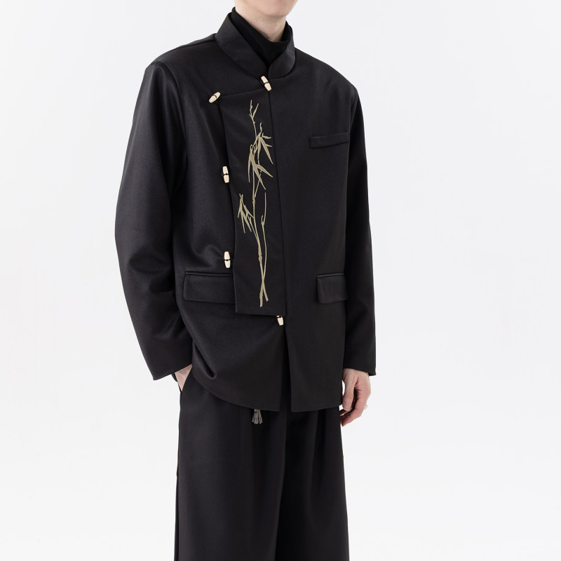 竹叶刺绣新中式西装外套男中国风复古斜襟盘扣唐装男士西服中山装