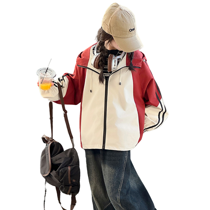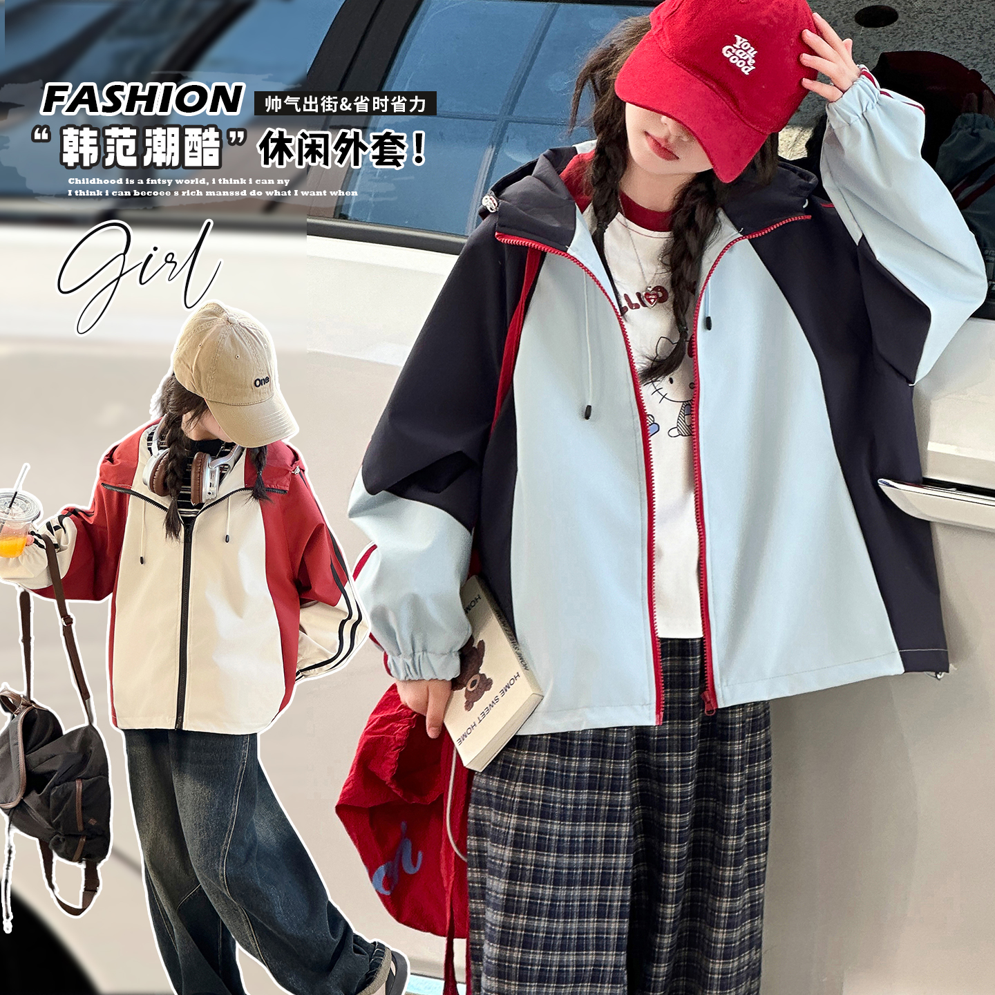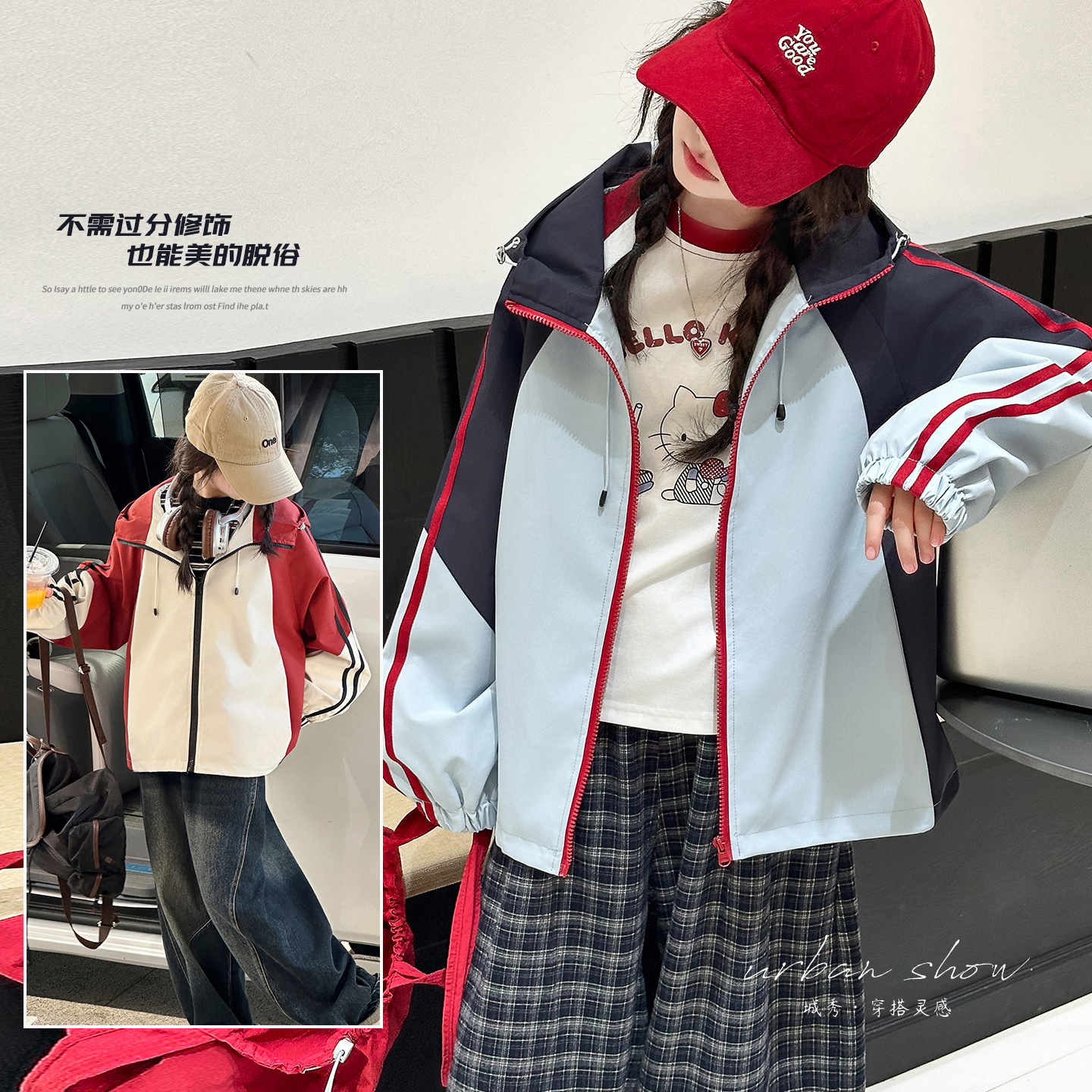 女童外套春秋款2025新款韩版拼色拉条连帽冲锋衣女孩中大童风衣潮