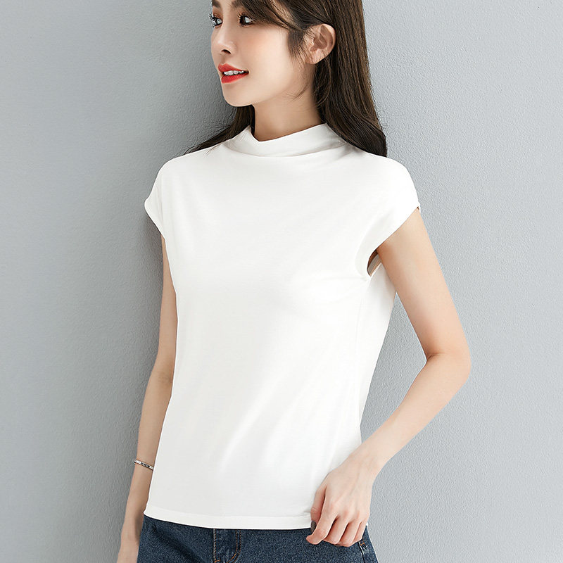 米白色莫代尔棉小高领连肩袖t恤女夏季新款修身百搭打底体恤衫
