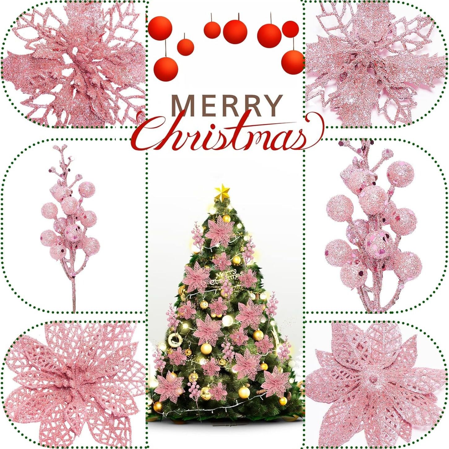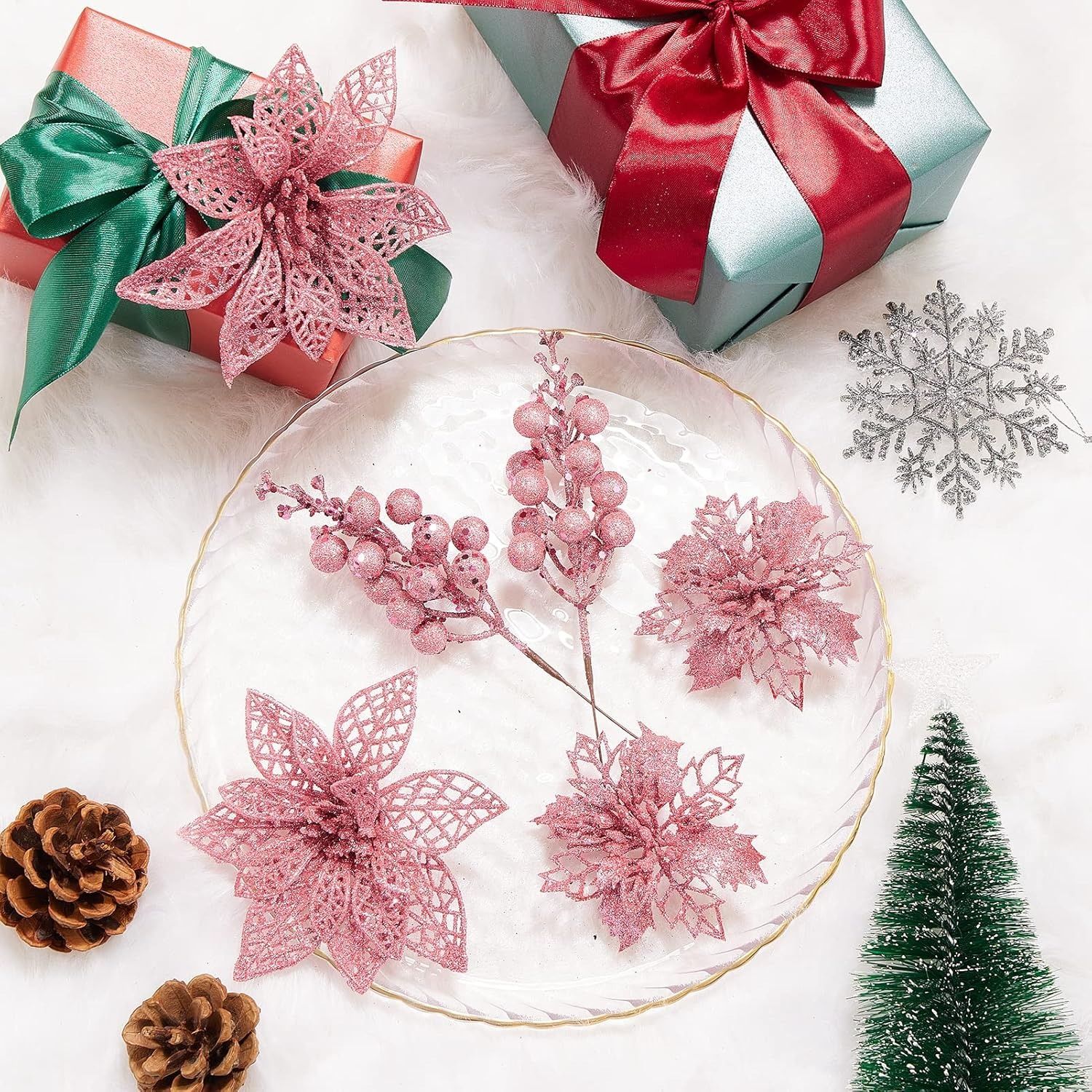 闪光镂空金粉圣诞花红果组合 圣诞树装饰挂件 diy圣诞花花环材料