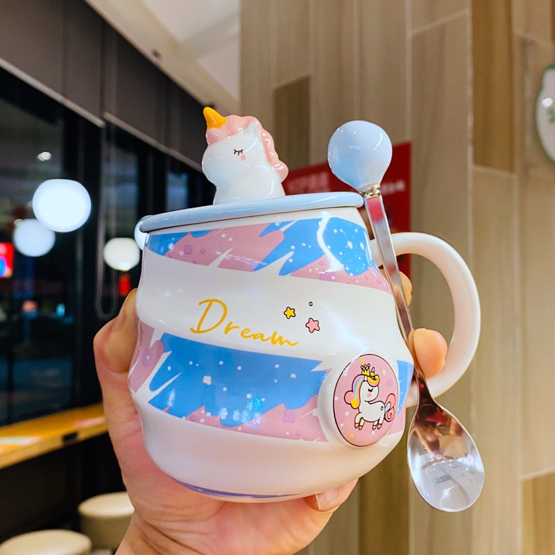 独角兽水杯彩虹马克杯咖啡杯带盖勺可爱女生家用喝水杯子陶瓷杯