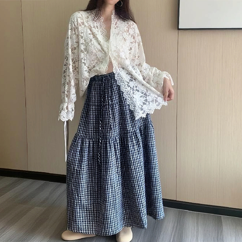 黑白格子中长裙高腰拼接百褶a字裙高腰显瘦宽松格子半身裙秋季