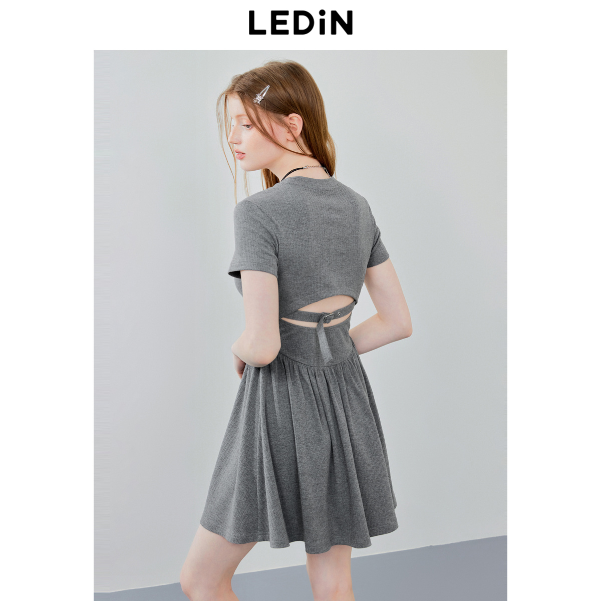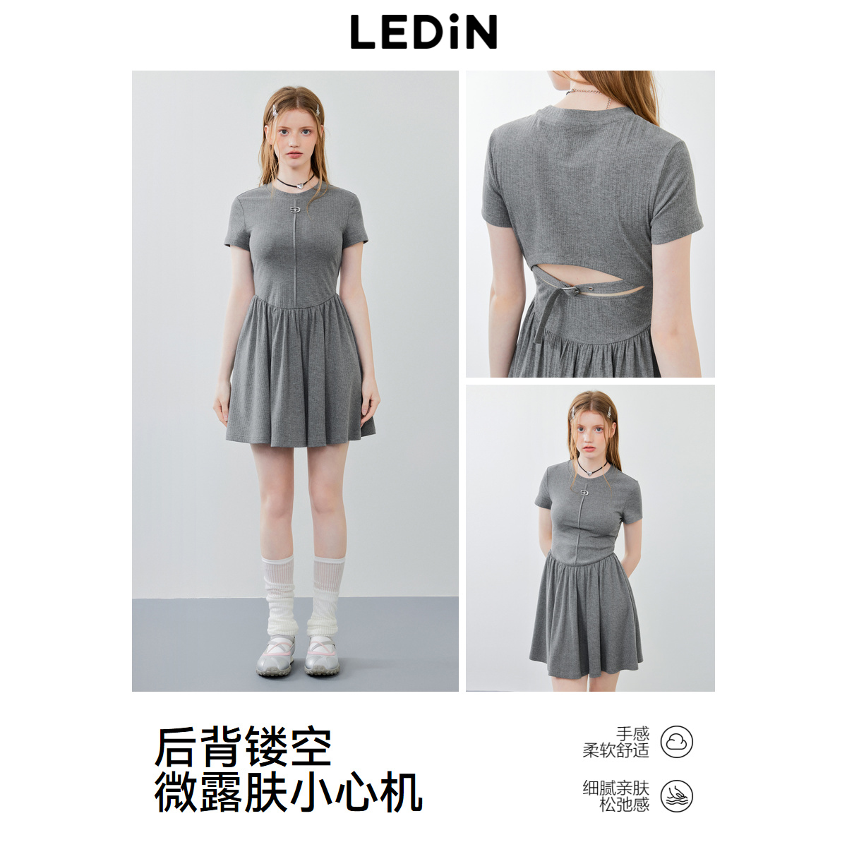 乐町针织短袖裙夏季新款设计感漏背连衣裙深灰色修身连衣短裙