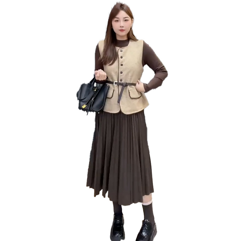 韩系马甲百褶连衣长裙子套装胖mm2025冬季新款显瘦宽松大码女装潮