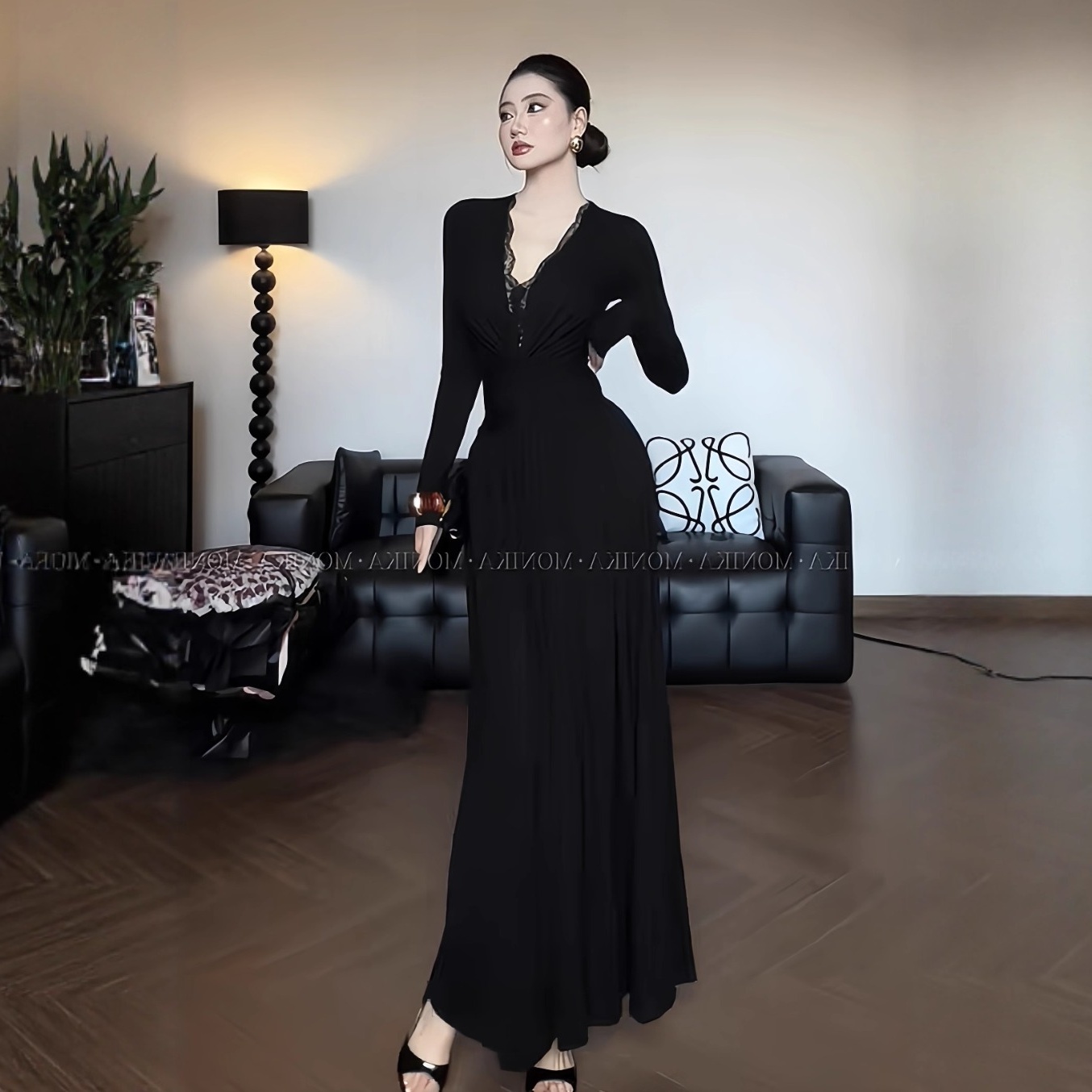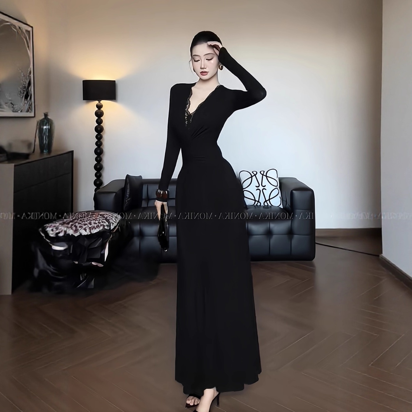 大码女装胖mm御姐蕾丝拼接v领长袖连衣裙2025新款高级感包臀裙子