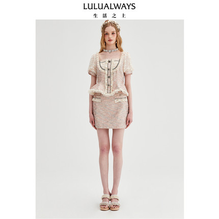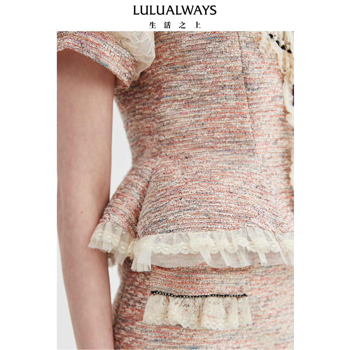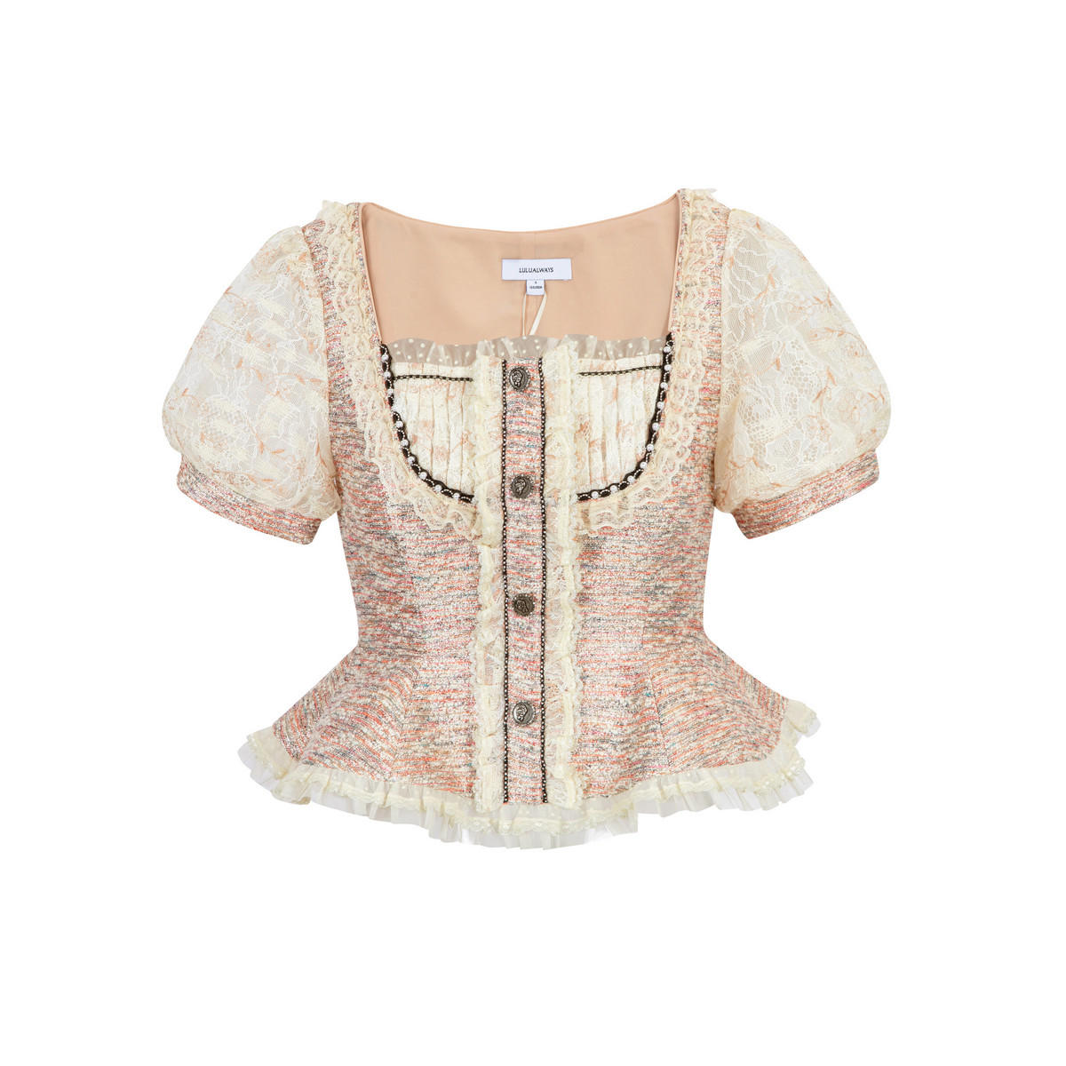 LULUALWAYS【商场同款】粗花呢蕾丝拼接方领泡泡袖衬衫