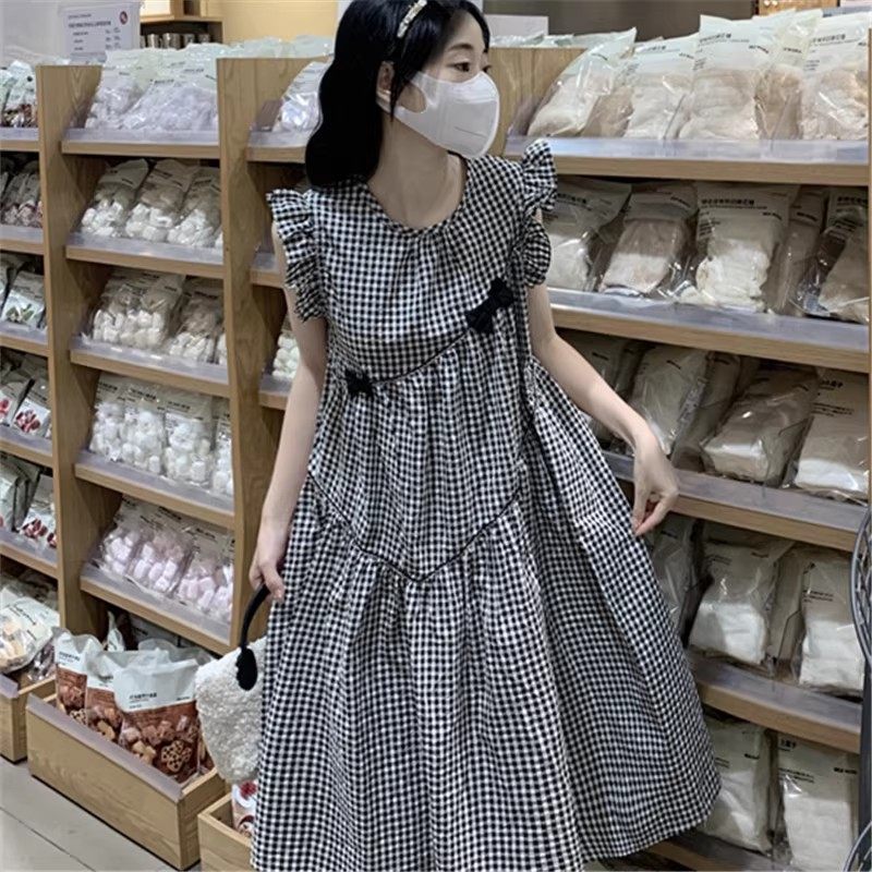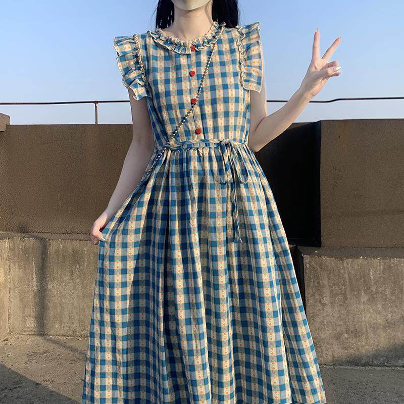 复古气质学院风连衣裙少女夏装2025新款初中高中学生格子收腰长裙