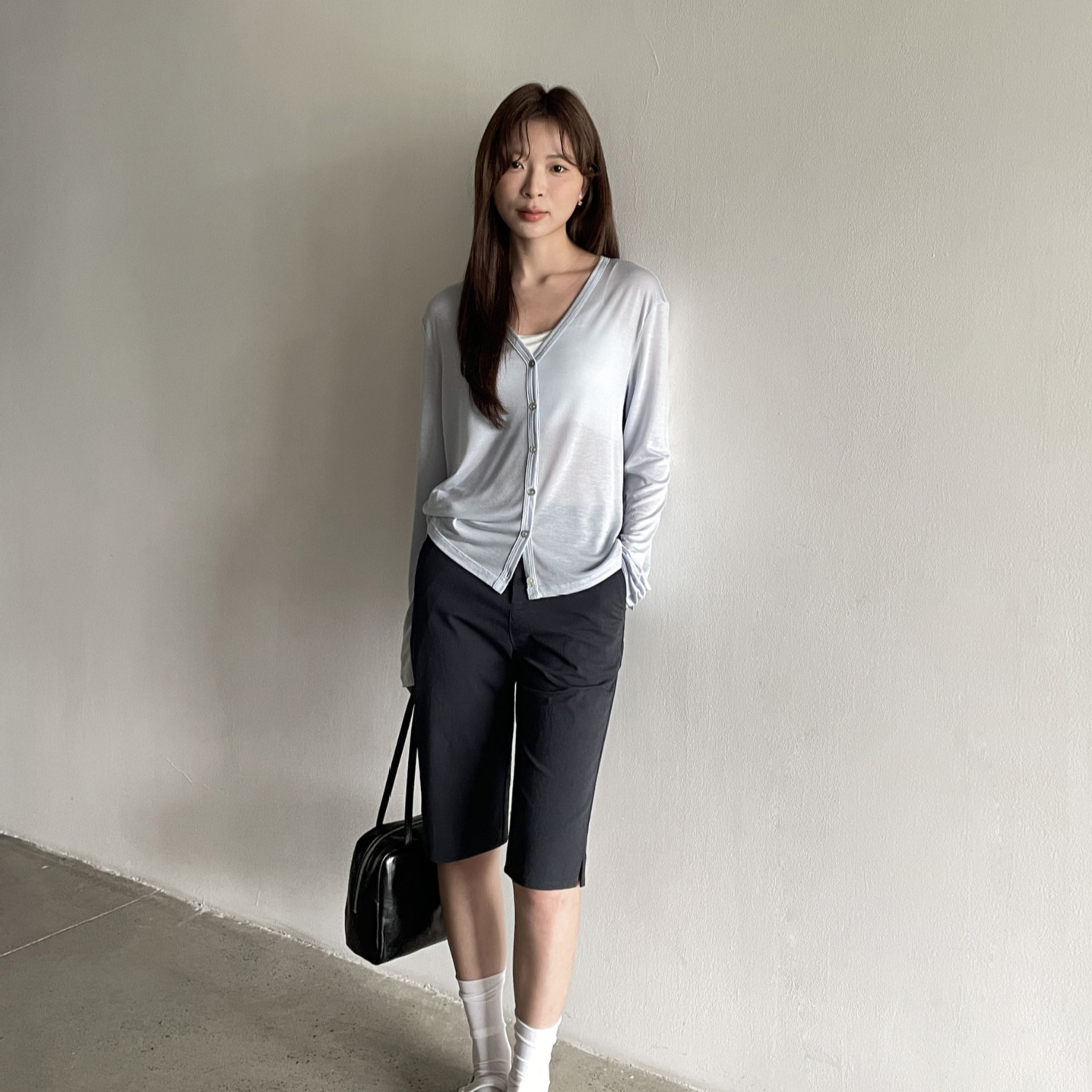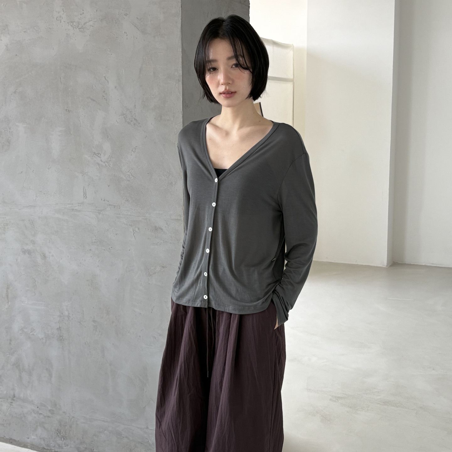 爱与南希十三行春韩风V领纯色百搭防晒莱赛尔开衫T恤女