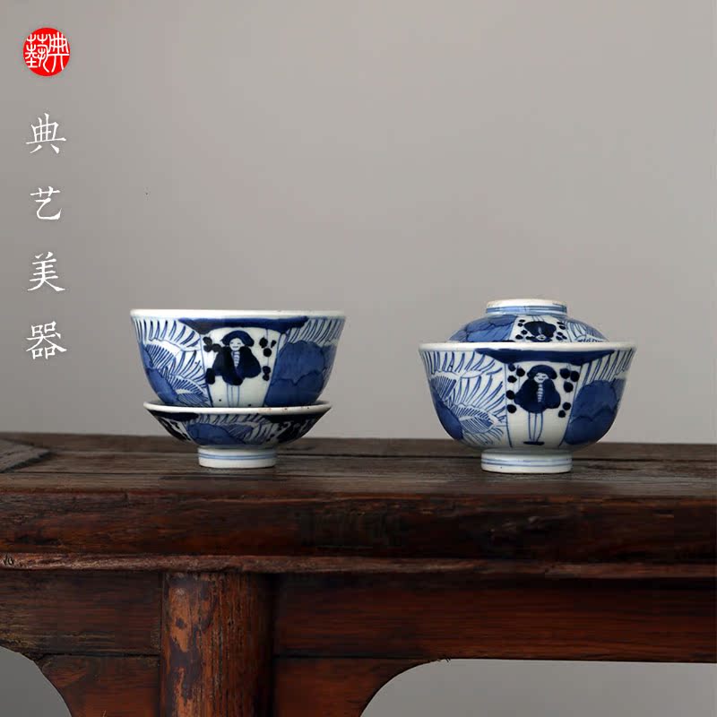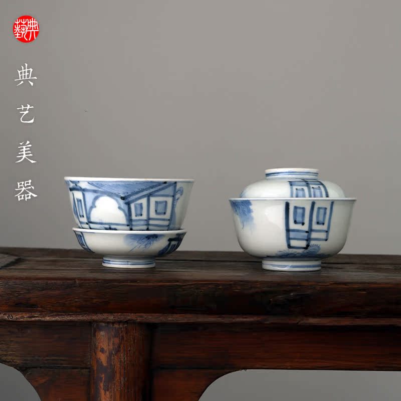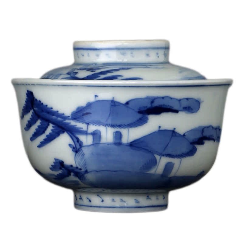 日本染付青花手绘文字建筑人物盖碗茶碗老货瓷器新品