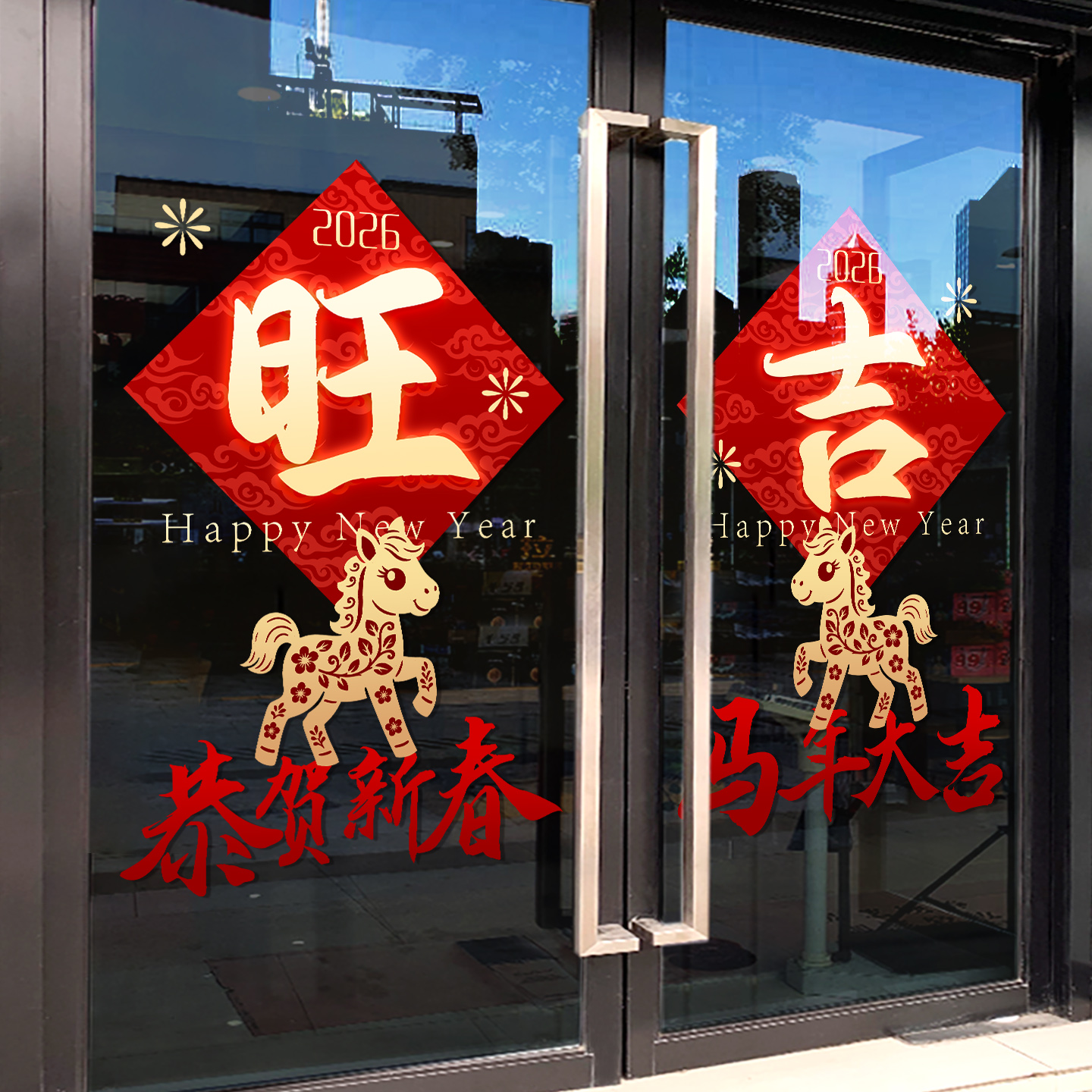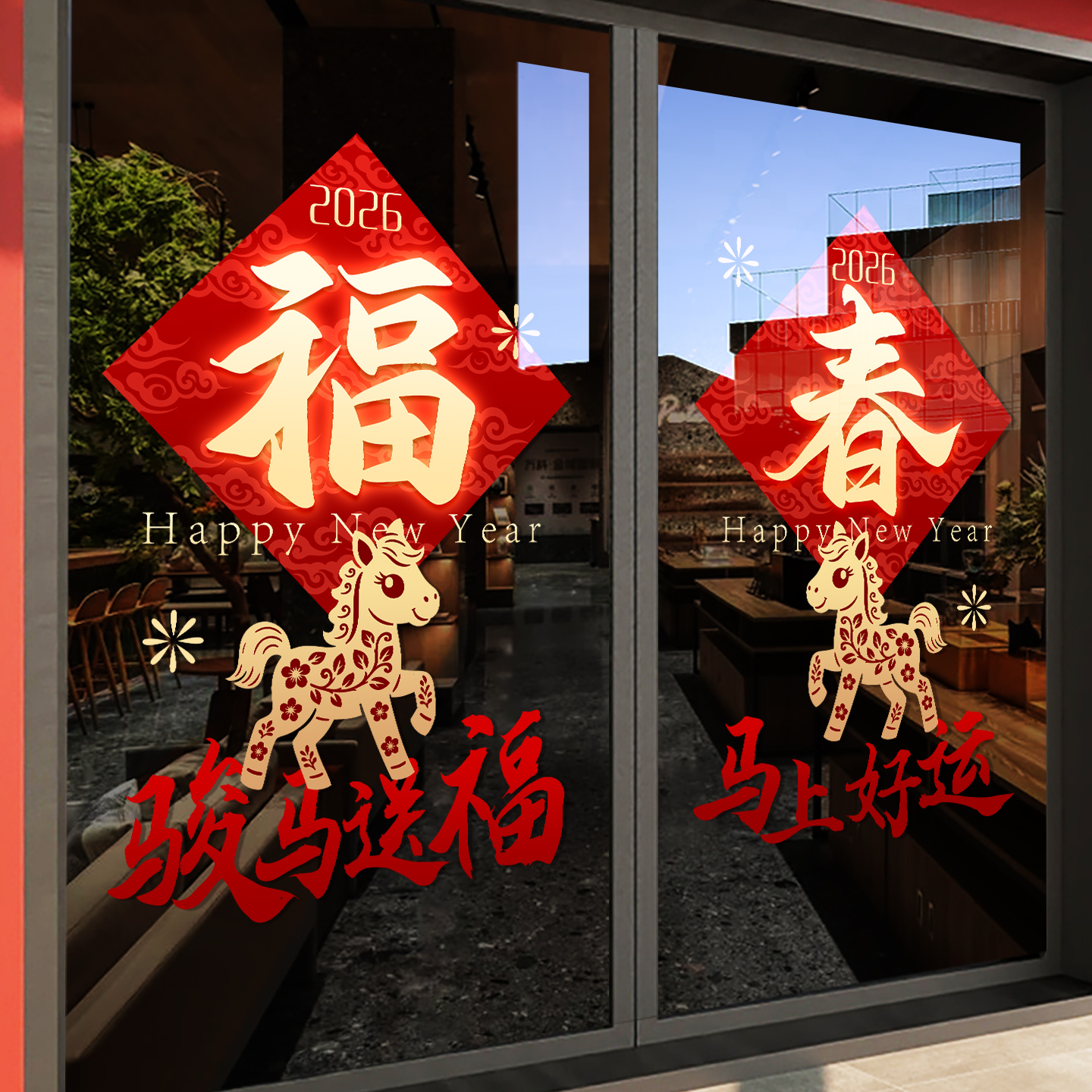 喜庆马年门贴静电玻璃窗花元旦2026春节布置贴纸新年装饰福字窗贴