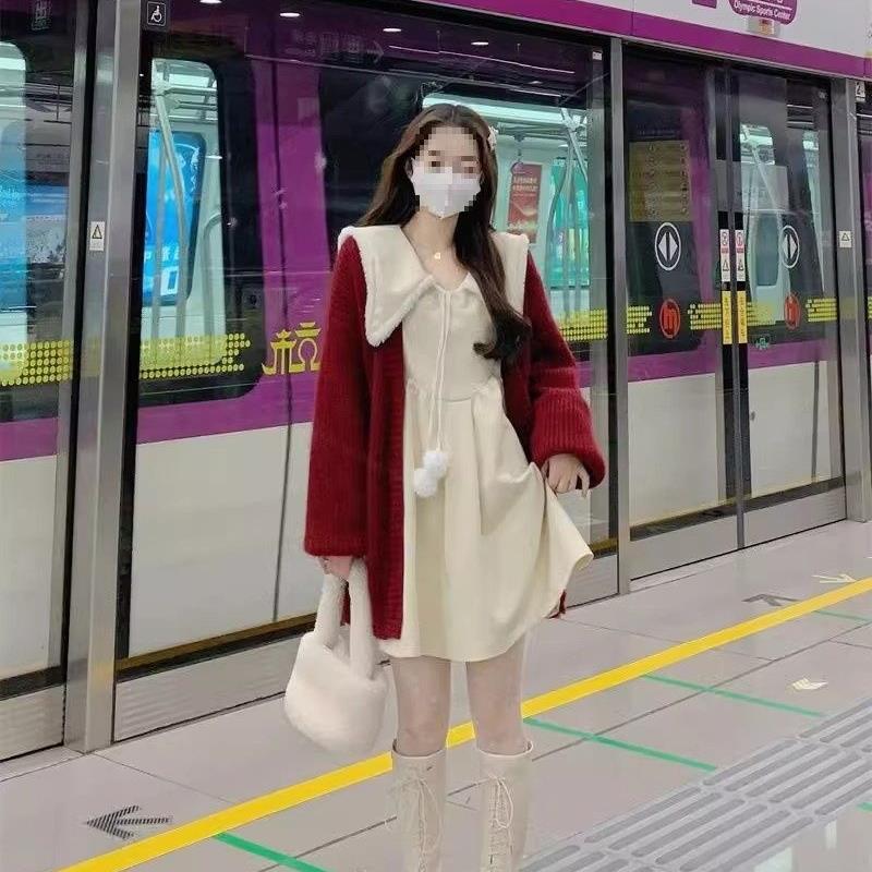 法式温柔风圣诞新年套装女秋冬娃娃领连衣裙+红色毛衣外套两件套