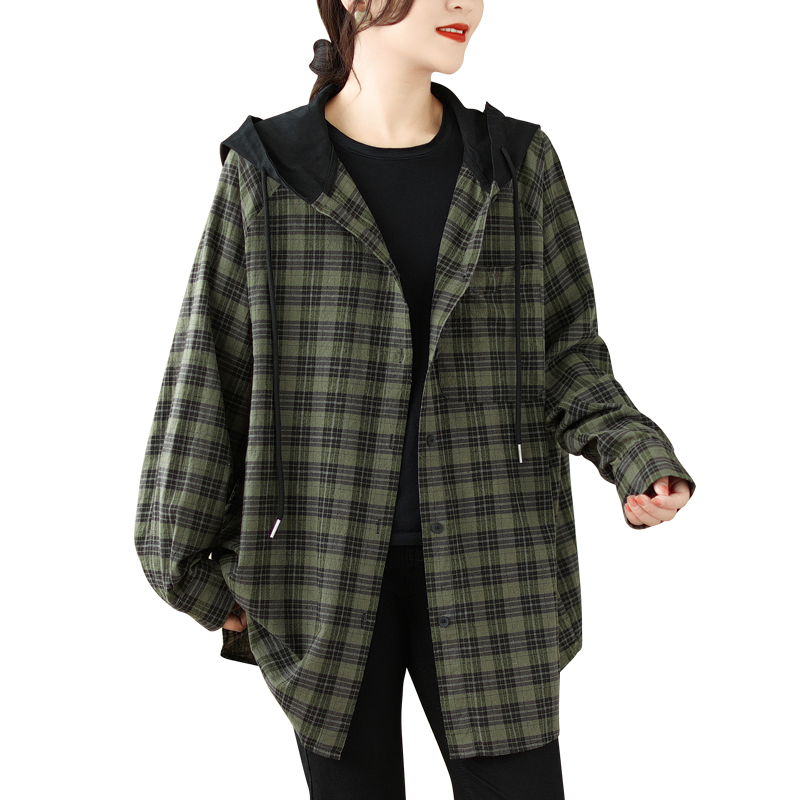 复古连帽磨毛格子衬衫外套女春秋大码胖mm遮肉显瘦中长款上衣外搭
