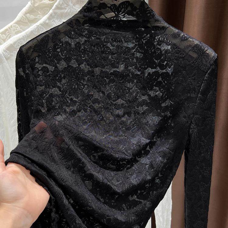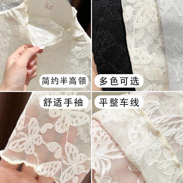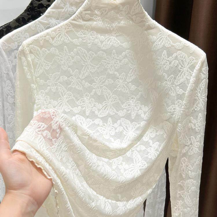 蝴蝶提花蕾丝打底衫女秋冬新款半高领内搭修身长袖薄纱上衣木耳边