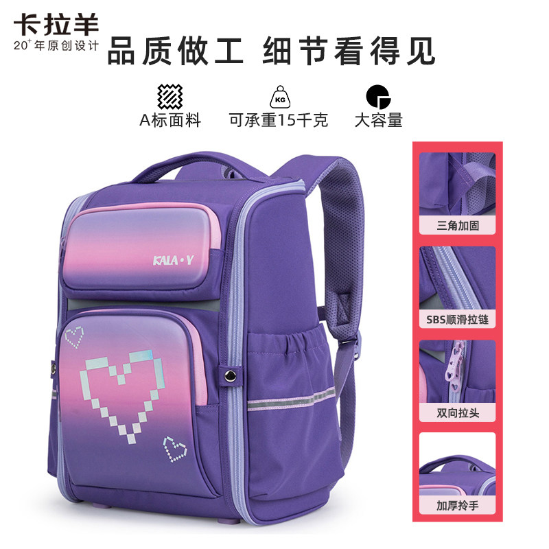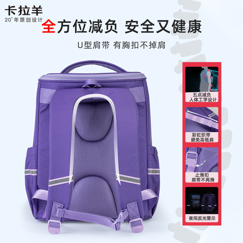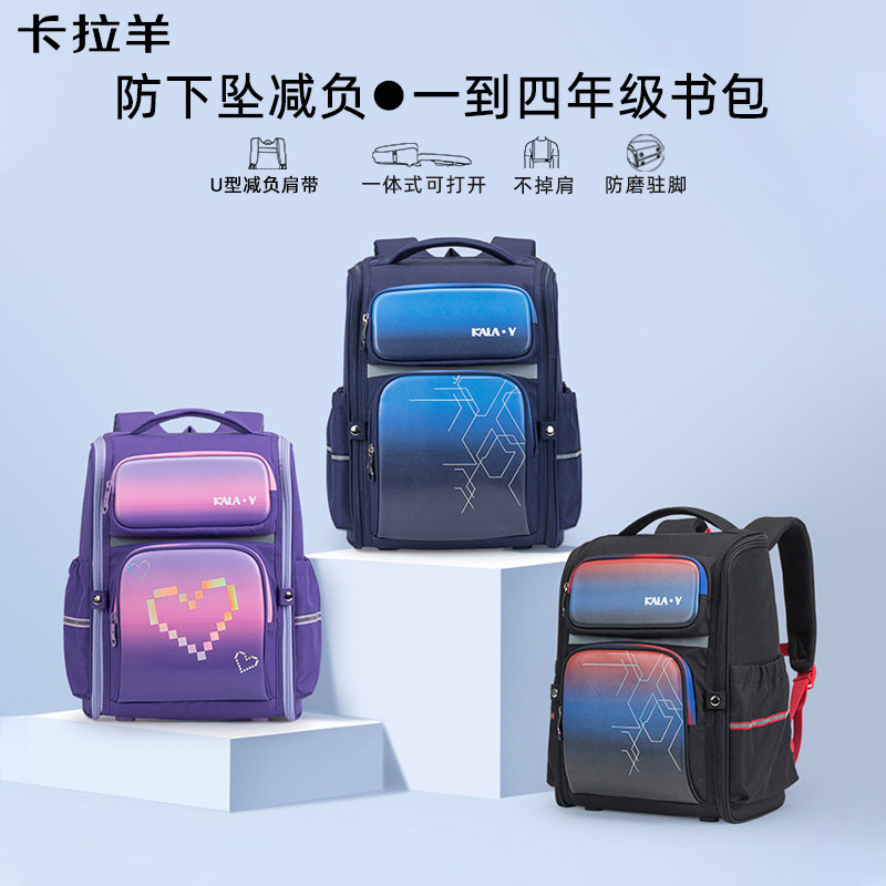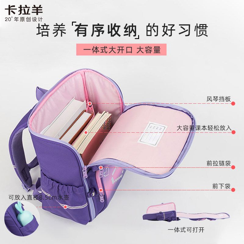 卡拉羊一片式减负双肩大容量大开口小学生3-6年级护脊防下坠书包