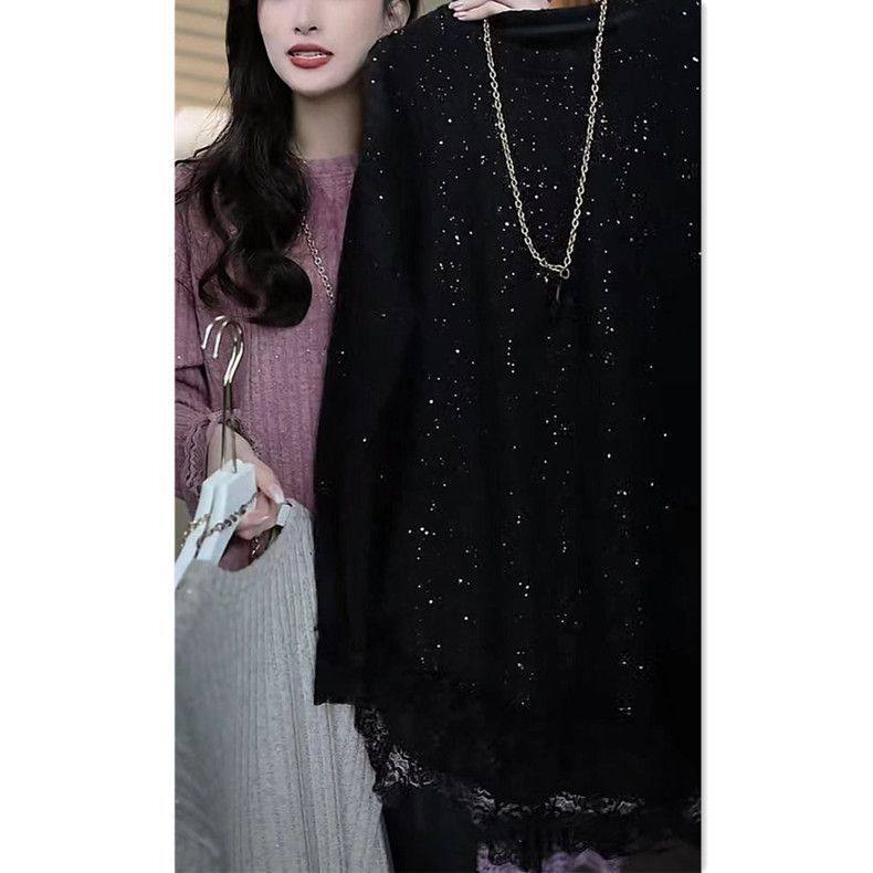 弧形开叉蕾丝边设计中长款加绒t恤女长袖秋冬加厚宽松遮屁股上衣