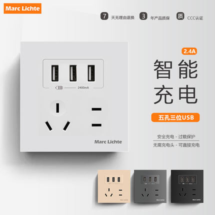 白色86型暗装五孔插座2.4A毫安 多口USB快充手机充电插座墙壁面板