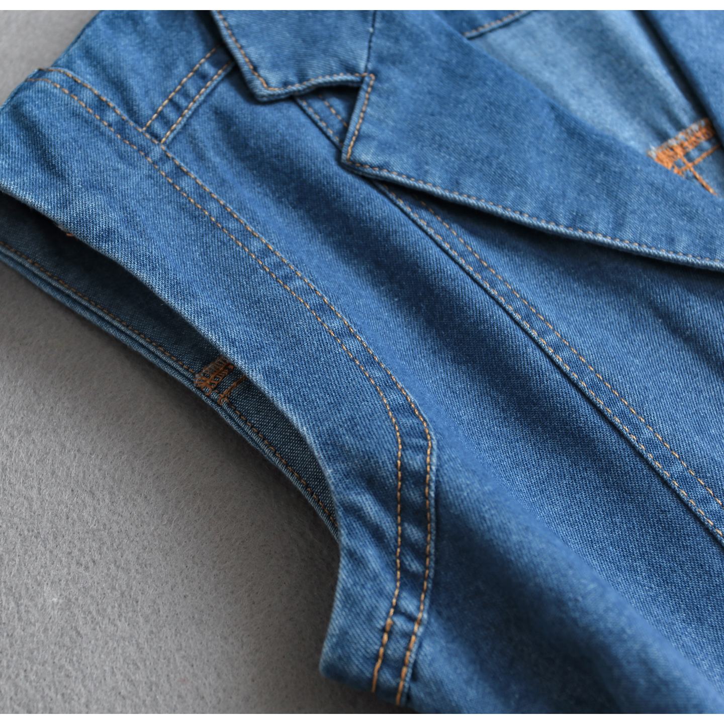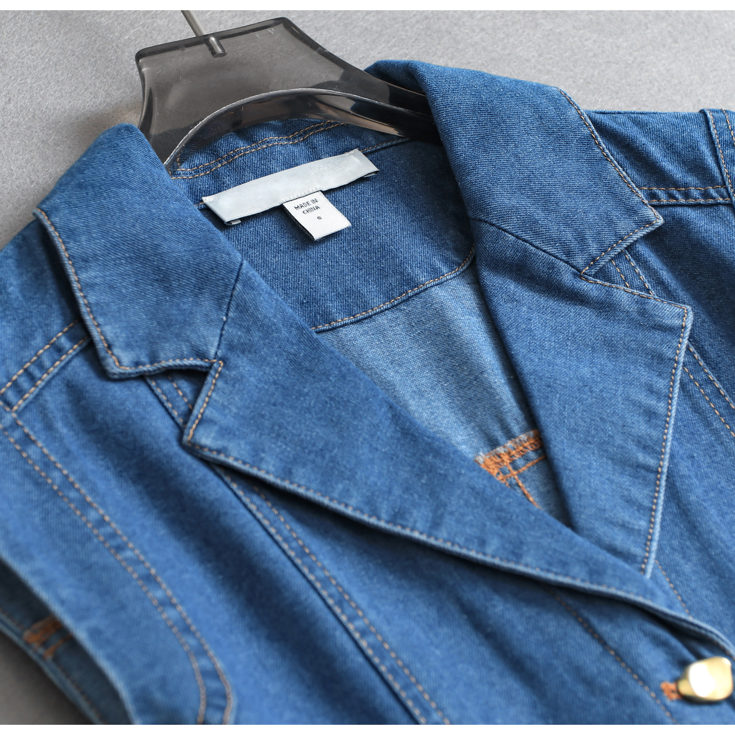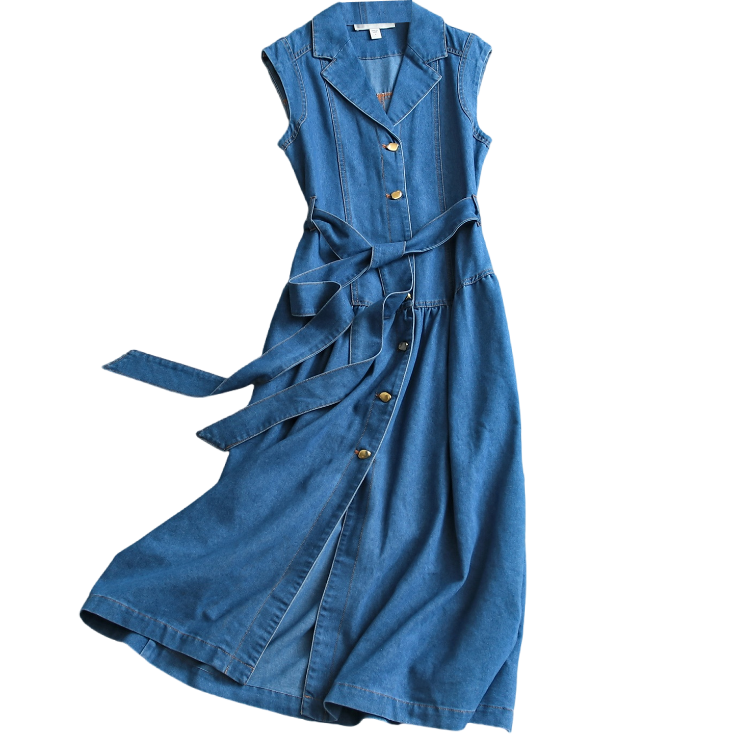 复古气质衬衫翻领无袖牛仔连衣裙2025秋季新款系带收腰长裙女B135