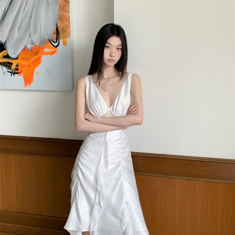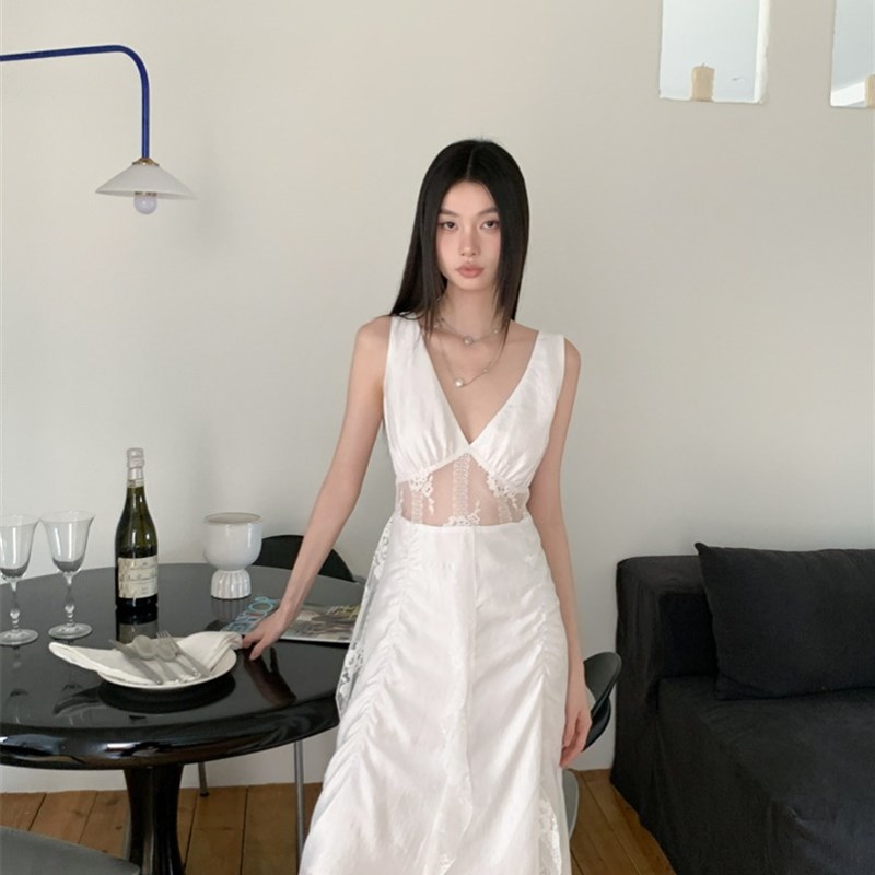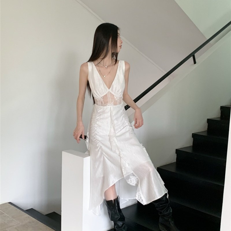 法式气质蕾丝拼接背心连衣裙女夏季吊带裙白色收腰长裙不规则裙子