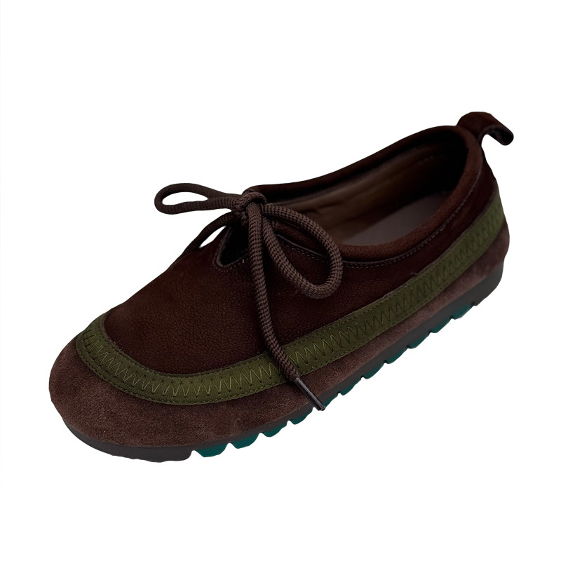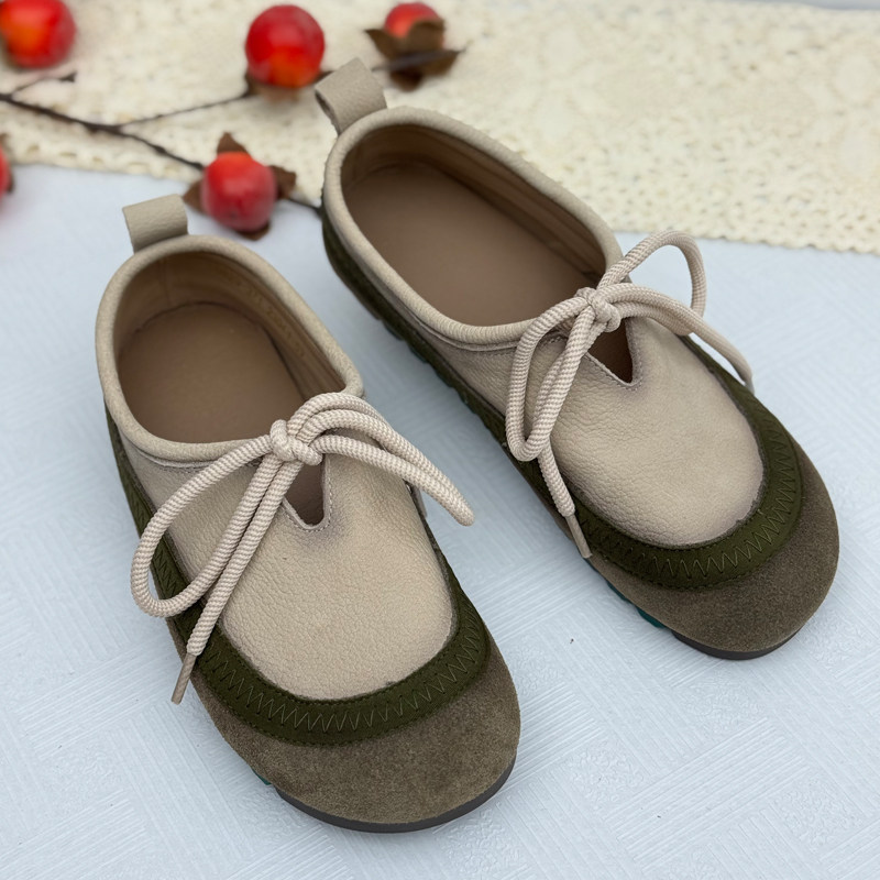 复古真皮浅口平跟系带妈妈单鞋