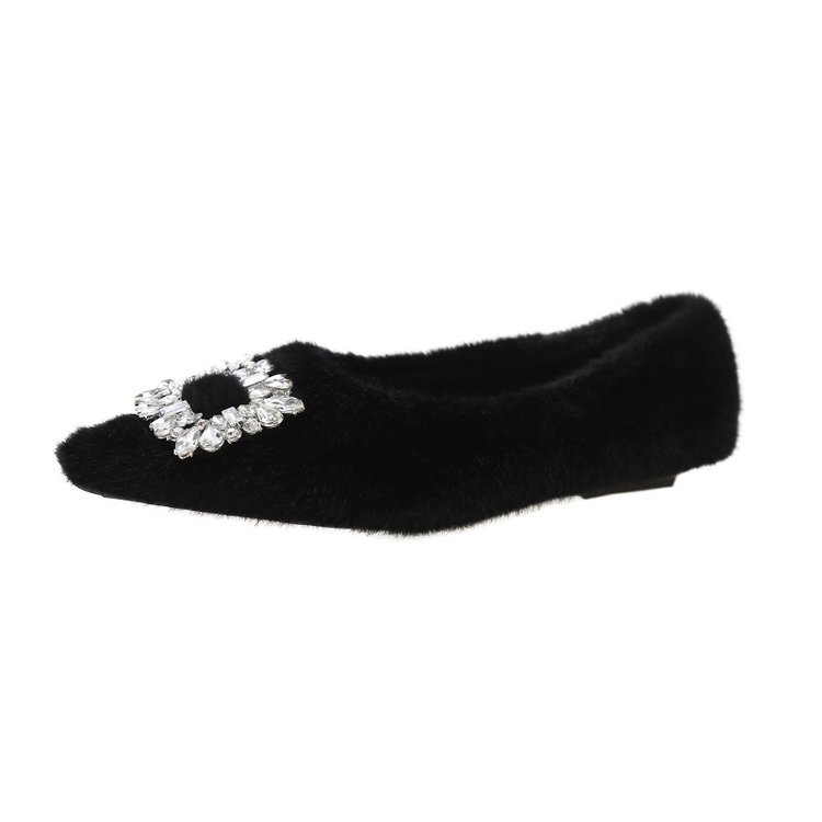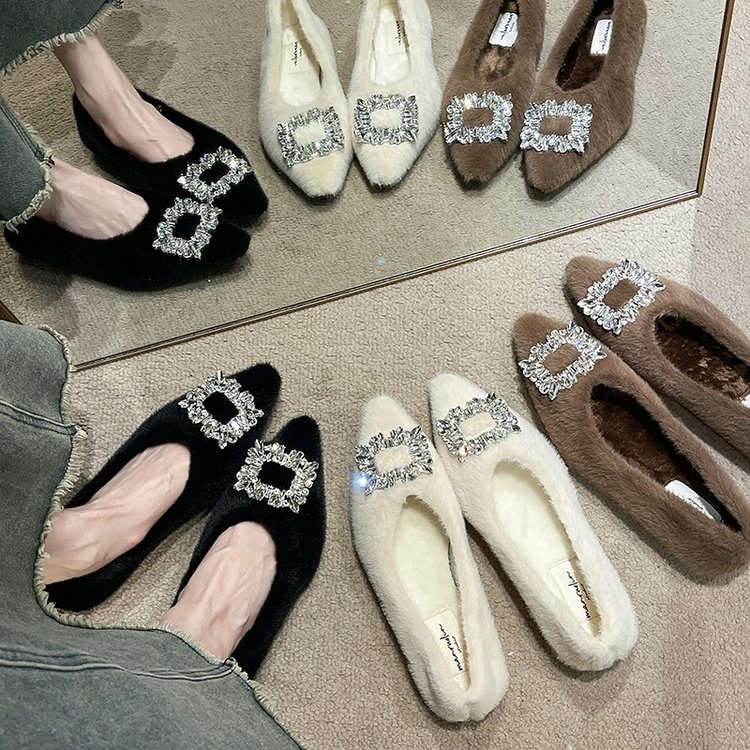 2025秋冬新款尖头水钻方扣内加绒平底单鞋保暖平跟毛毛鞋浅口女鞋